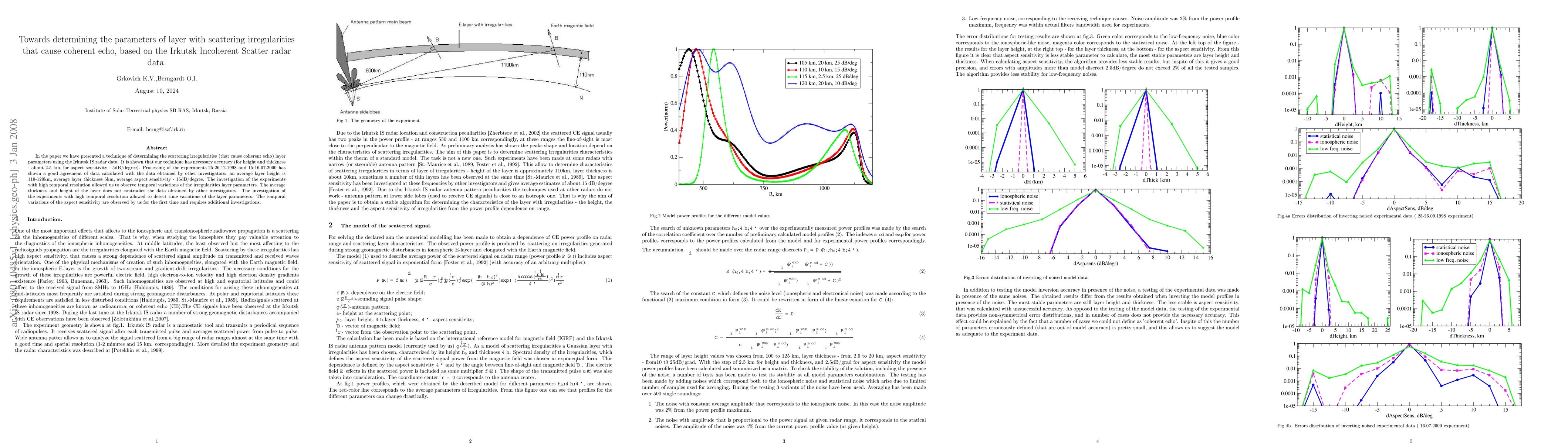 This paper presents a technique for determining the parameters of scattering irregularities in the ionosphere using Irkutsk Incoherent Scatter radar data, achieving accuracy of about 2.5 km for height and thickness. The technique's results align well with previous studies, revealing temporal variations in layer parameters, including previously unreported changes in aspect sensitivity.