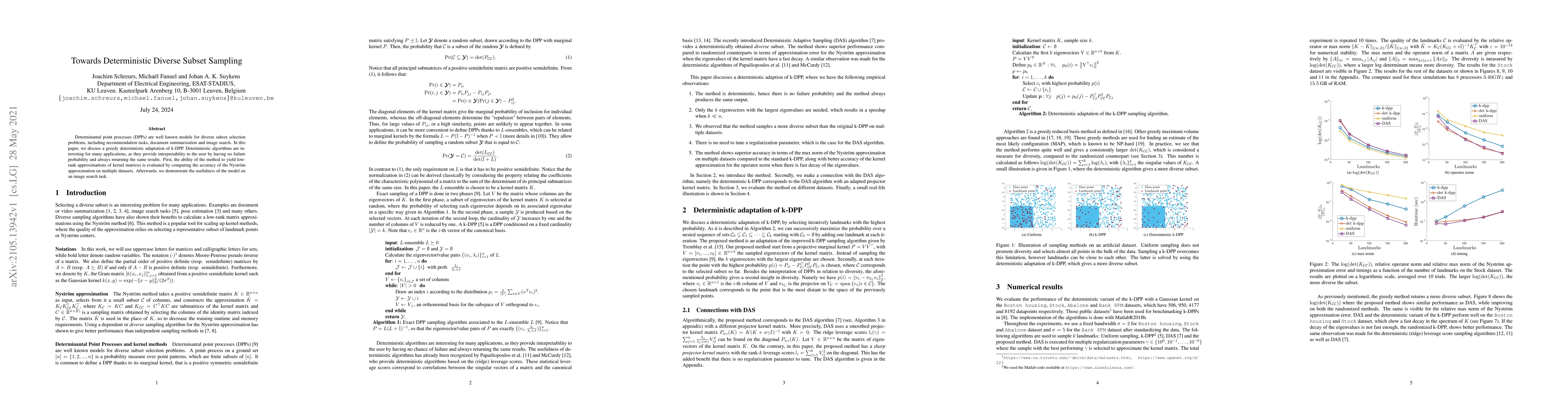 This paper proposes a deterministic adaptation of k-DPP for diverse subset sampling, emphasizing interpretability and consistent results. It evaluates the method's effectiveness through low-rank approximations and demonstrates its utility in an image search task.