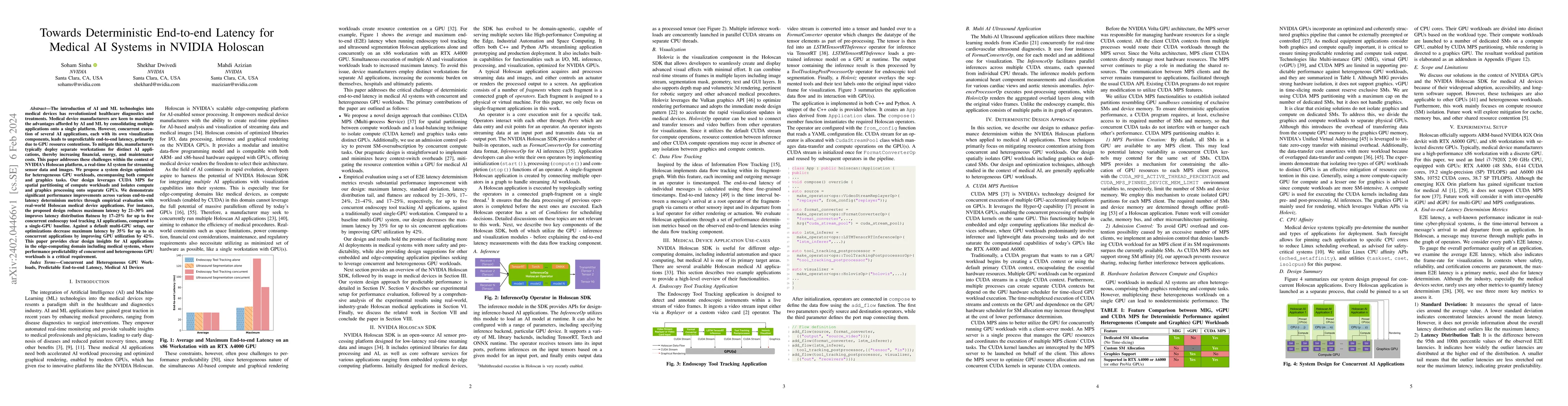 This paper proposes a system design within the NVIDIA Holoscan platform to achieve deterministic end-to-end latency for medical AI applications by optimizing GPU resource allocation and workload partitioning, leading to significant reductions in maximum latency and improved latency distribution flatness.