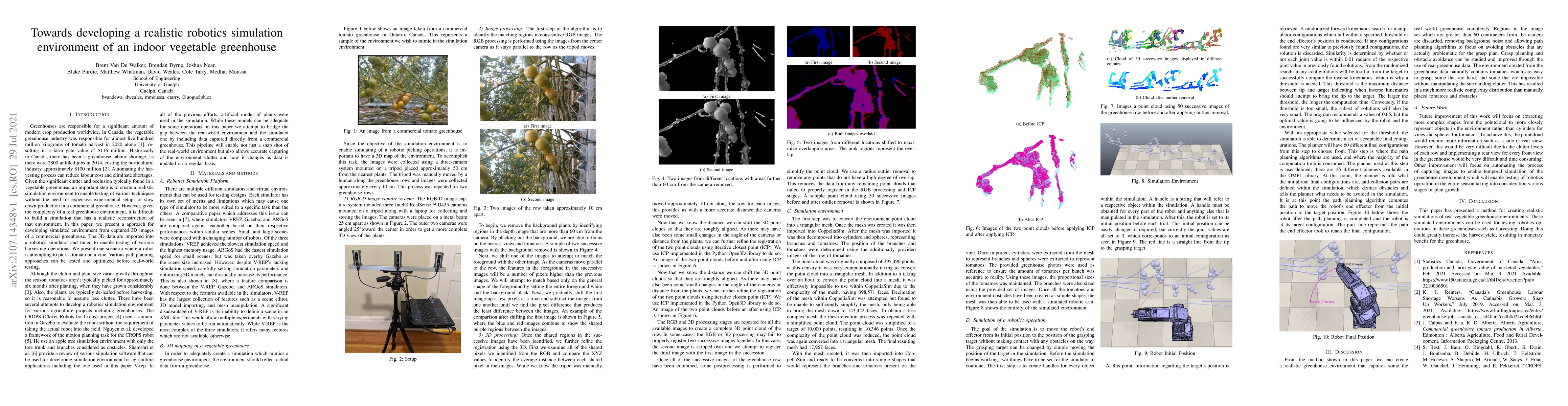 This article presents a method for developing a realistic robotics simulation environment for application in vegetable greenhouses. The method pipeline starts with the construction of a 3D cloud images of the greenhouse rows. This data is then used to develop a robotics simulation environment using the CoppeliaSim simulation software. The method has been tested using images from a commercial greenhouse.