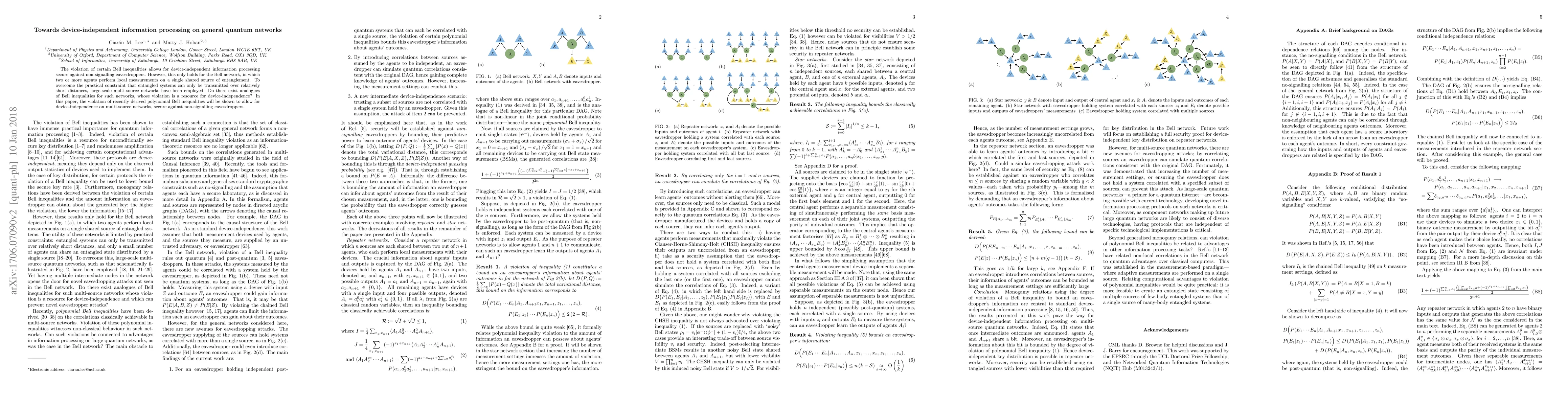 The paper presents a method for device-independent information processing on multi-source quantum networks by leveraging the violation of polynomial Bell inequalities, ensuring security against non-signalling eavesdroppers.