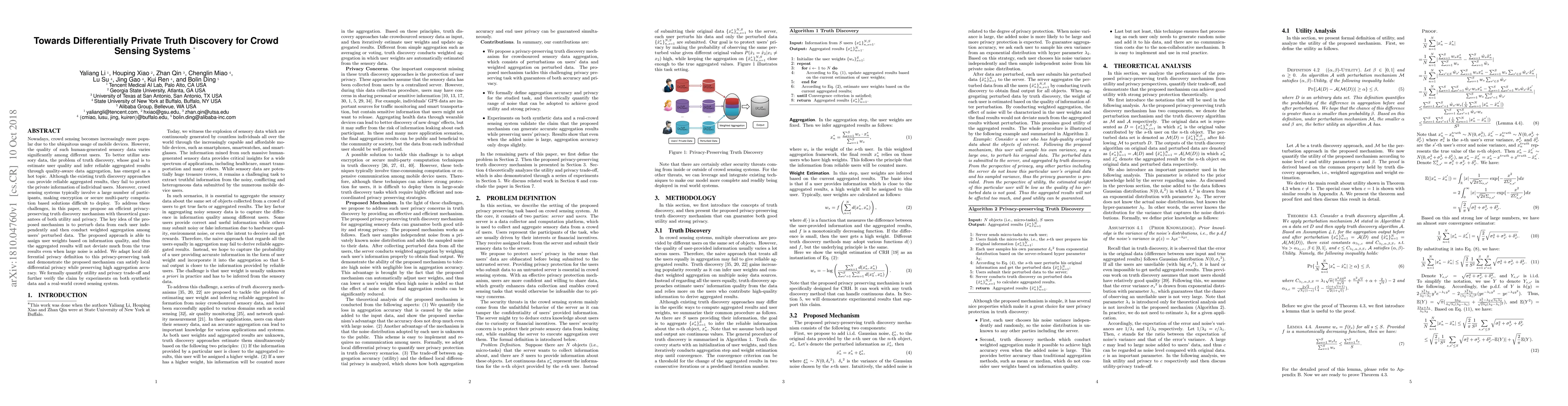 This paper proposes a differentially private truth discovery mechanism for crowd sensing systems to estimate user quality and infer reliable aggregated results while protecting user privacy. The approach perturbs individual user data and conducts weighted aggregation, ensuring high accuracy and local differential privacy.