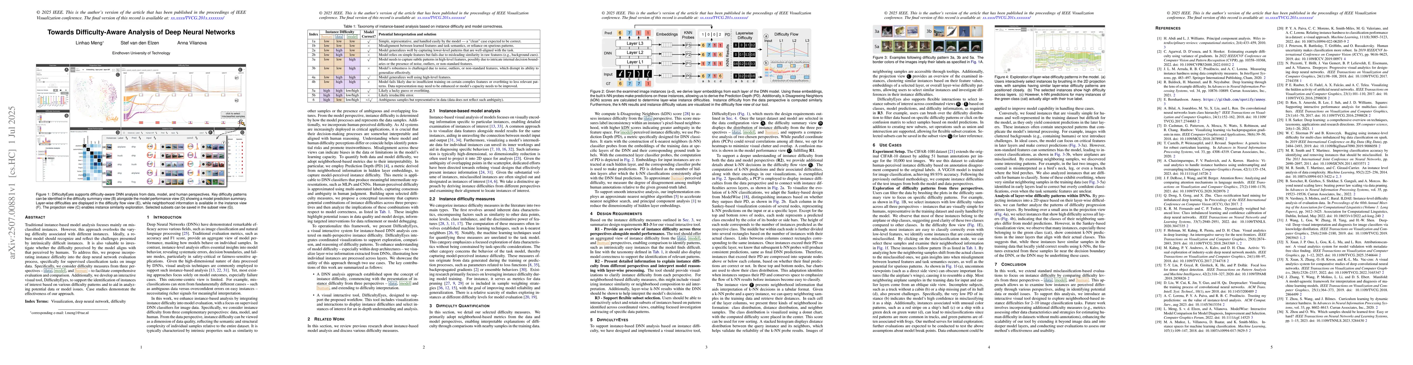 Traditional instance-based model analysis focuses mainly on misclassified instances. However, this approach overlooks the varying difficulty associated with different instances. Ideally, a robust model should recognize and reflect the challenges presented by intrinsically difficult instances. It is also valuable to investigate whether the difficulty perceived by the model aligns with that perceived by humans. To address this, we propose incorporating instance difficulty into the deep neural network evaluation process, specifically for supervised classification tasks on image data. Specifically, we consider difficulty measures from three perspectives -- data, model, and human -- to facilitate comprehensive evaluation and comparison. Additionally, we develop an interactive visual tool, DifficultyEyes, to support the identification of instances of interest based on various difficulty patterns and to aid in analyzing potential data or model issues. Case studies demonstrate the effectiveness of our approach.