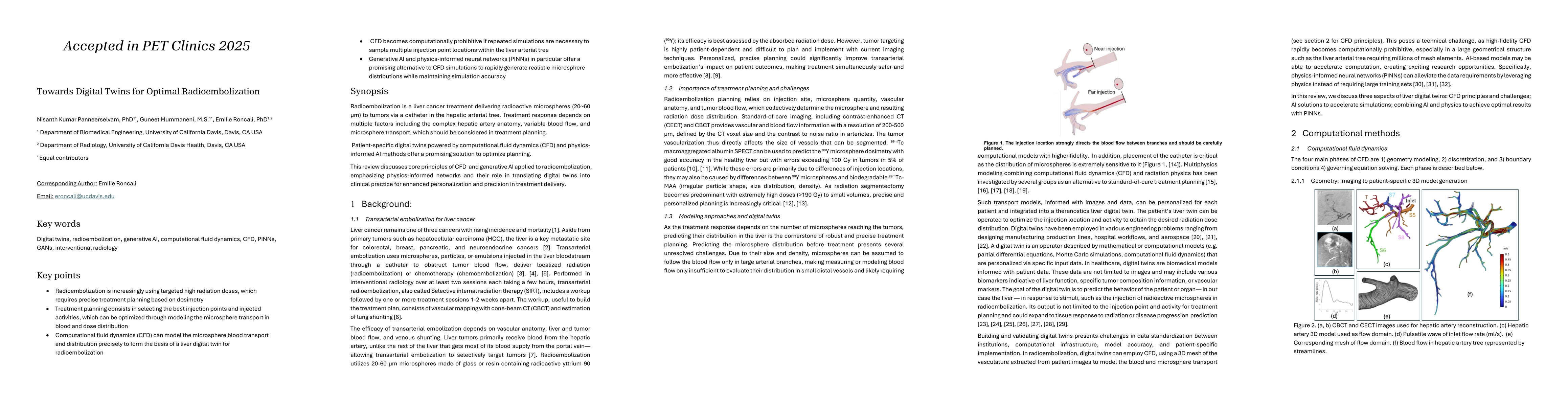Radioembolization is a localized liver cancer treatment that delivers radioactive microspheres (30 micron) to tumors via a catheter inserted in the hepatic arterial tree. The goal is to maximize therapeutic efficacy while minimizing damage to healthy liver tissue. However, optimization is challenging due to complex hepatic artery anatomy, variable blood flow, and uncertainty in microsphere transport. The creation of dynamic, patient-specific digital twins may provide a transformative solution to these challenges. This work outlines a framework for a liver radioembolization digital twin using high-fidelity computational fluid dynamics (CFD) and/or recent physics-informed machine learning approaches. The CFD approach involves microsphere transport calculations in the hepatic arterial tree with individual patient data, which enables personalized treatment planning. Although accurate, traditional CFD is computationally expensive and limits clinical applicability. To accelerate simulations, physics-informed neural networks (PINNs) and their generative extensions play an increasingly important role. PINNs integrate governing equations, such as the Navier-Stokes equations, directly into the neural network training process, enabling mesh-free, data-efficient approximation of blood flow and microsphere transport. Physics-informed generative adversarial networks (PI-GANs), diffusion models (PI-DMs), and transformer-based architectures further enable uncertainty-aware, temporally resolved predictions with reduced computational cost. These AI surrogates not only maintain physical fidelity but also support rapid sampling of diverse flow scenarios, facilitating real-time decision support. Together, CFD and physics-informed AI methods form the foundation of dynamic, patient-specific digital twin to optimize radioembolization planning and ultimately improve clinical outcomes.
