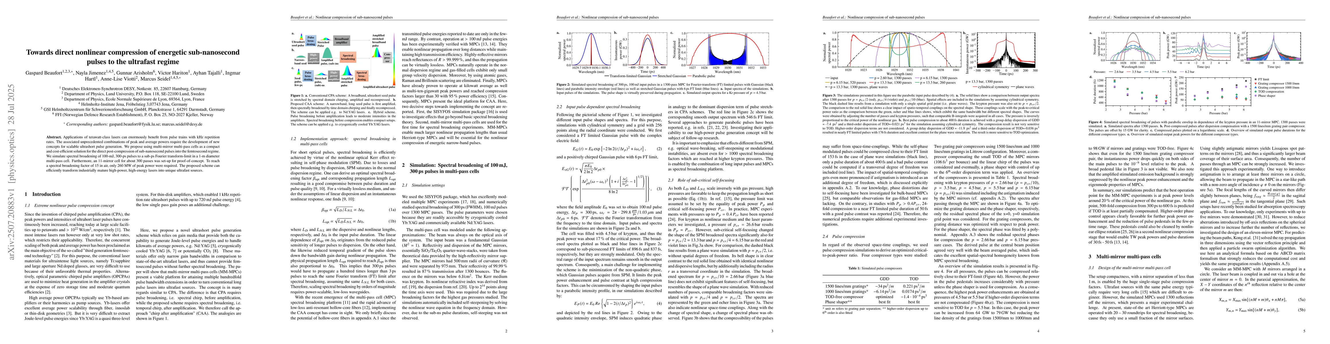 Applications of terawatt-class lasers can enormously benefit from pulse trains with kHz repetition rates. The associated unprecedented combinations of peak and average powers require the development of new concepts for scalable ultrashort pulse generation. We propose using multi-mirror multi-pass cells as a compact and cost-efficient solution for the direct post-compression of sub-nanosecond pulses into the femtosecond regime. We simulate spectral broadening of 100-mJ, 300-ps pulses to a sub-ps Fourier transform-limit in a 1-m diameter multi-pass cell. Furthermore, an 11-mirror cell for about 300 passes was set-up for proof-of-concept. To reach a spectral broadening factor of 15 in air, only 260 MW of peak power were required. The proposed scheme can efficiently transform industrially mature high-power, high-energy lasers into unique ultrafast sources.