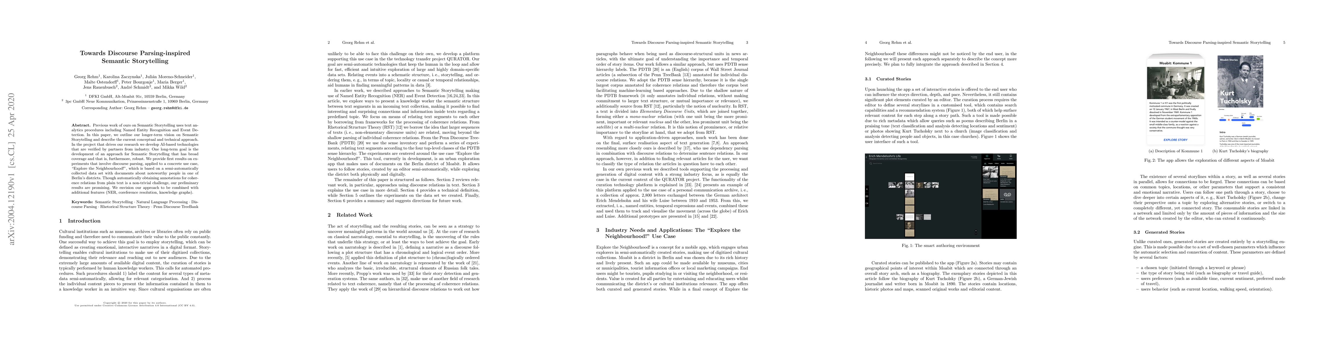 Previous work of ours on Semantic Storytelling uses text analytics procedures including Named Entity Recognition and Event Detection. In this paper, we outline our longer-term vision on Semantic Storytelling and describe the current conceptual and technical approach. In the project that drives our research we develop AI-based technologies that are verified by partners from industry. One long-term goal is the development of an approach for Semantic Storytelling that has broad coverage and that is, furthermore, robust. We provide first results on experiments that involve discourse parsing, applied to a concrete use case, "Explore the Neighbourhood!", which is based on a semi-automatically collected data set with documents about noteworthy people in one of Berlin's districts. Though automatically obtaining annotations for coherence relations from plain text is a non-trivial challenge, our preliminary results are promising. We envision our approach to be combined with additional features (NER, coreference resolution, knowledge graphs