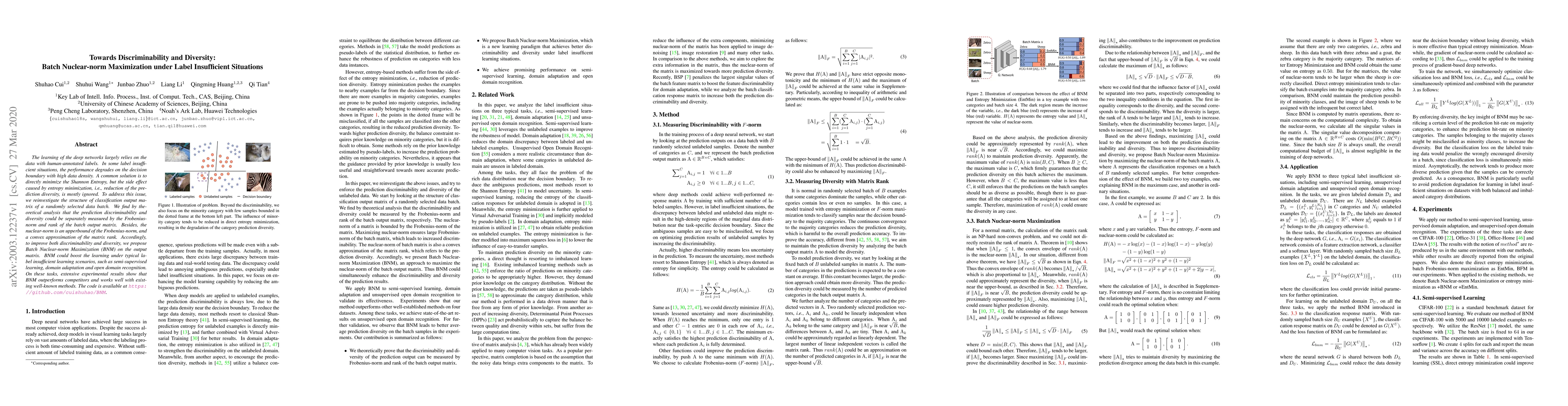 The learning of the deep networks largely relies on the data with human-annotated labels. In some label insufficient situations, the performance degrades on the decision boundary with high data density. A common solution is to directly minimize the Shannon Entropy, but the side effect caused by entropy minimization, i.e., reduction of the prediction diversity, is mostly ignored. To address this issue, we reinvestigate the structure of classification output matrix of a randomly selected data batch. We find by theoretical analysis that the prediction discriminability and diversity could be separately measured by the Frobenius-norm and rank of the batch output matrix. Besides, the nuclear-norm is an upperbound of the Frobenius-norm, and a convex approximation of the matrix rank. Accordingly, to improve both discriminability and diversity, we propose Batch Nuclear-norm Maximization (BNM) on the output matrix. BNM could boost the learning under typical label insufficient learning scenarios, such as semi-supervised learning, domain adaptation and open domain recognition. On these tasks, extensive experimental results show that BNM outperforms competitors and works well with existing well-known methods. The code is available at https://github.com/cuishuhao/BNM.