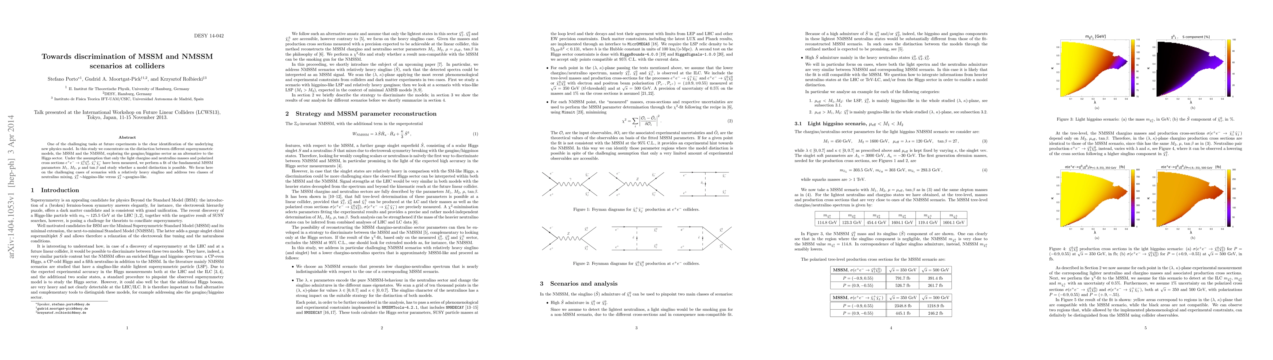 One of the challenging tasks at future experiments is the clear identification of the underlying new physics model. In this study we concentrate on the distinction between different supersymmetric models, the MSSM and the NMSSM, exploring the gaugino/higgsino sector as an alternative to the Higgs sector. Under the assumption that only the light chargino and neutralino masses and polarized cross sections $e^+e^-\to \tilde{\chi}^0_i\tilde{\chi}^0_j$, $\tilde{\chi}^+_i\tilde{\chi}^-_j$ have been measured, we perform a fit of the fundamental MSSM parameters $M_1$, $M_2$, $\mu$ and $\tan\beta$ and study whether a model distinction is possible. We focus here on the challenging cases of scenarios with a relatively heavy singlino and address two classes of neutralino mixing, $\tilde{\chi}^0_1\sim$higgsino-like versus $\tilde{\chi}^0_1\sim$gaugino-like.