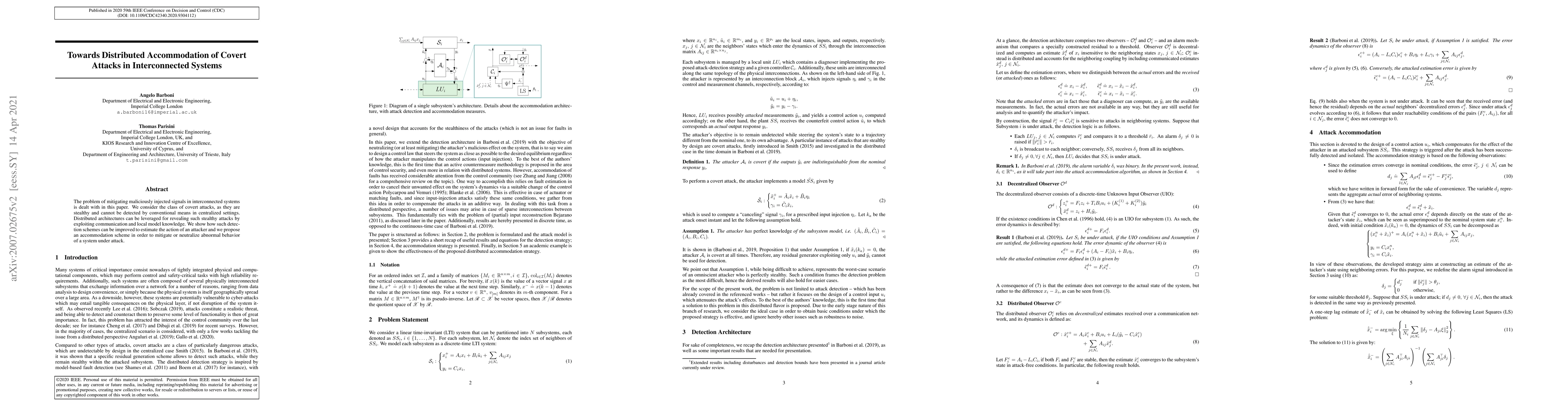 This paper addresses the challenge of detecting and mitigating covert attacks in interconnected systems, leveraging distributed architectures to reveal stealthy malicious signals. It proposes improved detection schemes and an accommodation strategy to neutralize abnormal system behavior caused by such attacks.