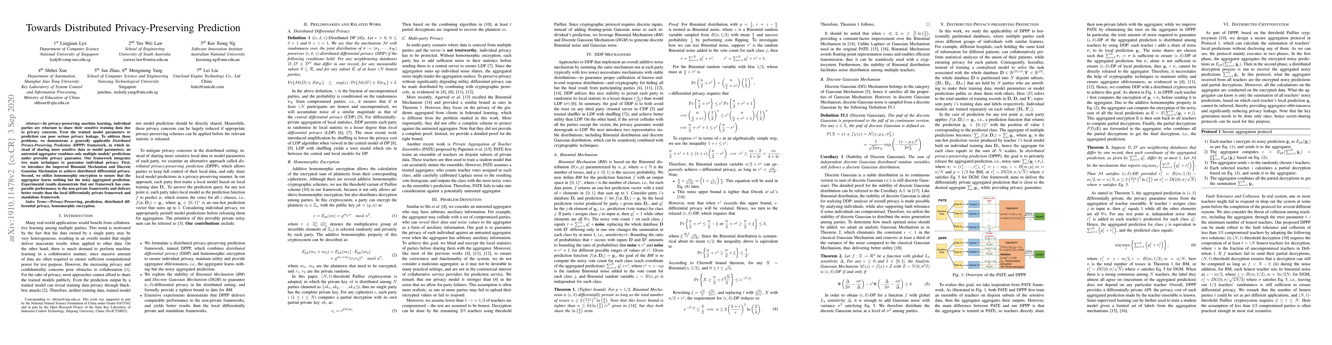 The paper proposes a Distributed Privacy-Preserving Prediction (DPPP) framework that combines multiple models' predictions without sharing sensitive data or model parameters, using improved Binomial and Discrete Gaussian Mechanisms for distributed differential privacy and homomorphic encryption to ensure privacy. Experimental results show comparable performance to non-private frameworks.