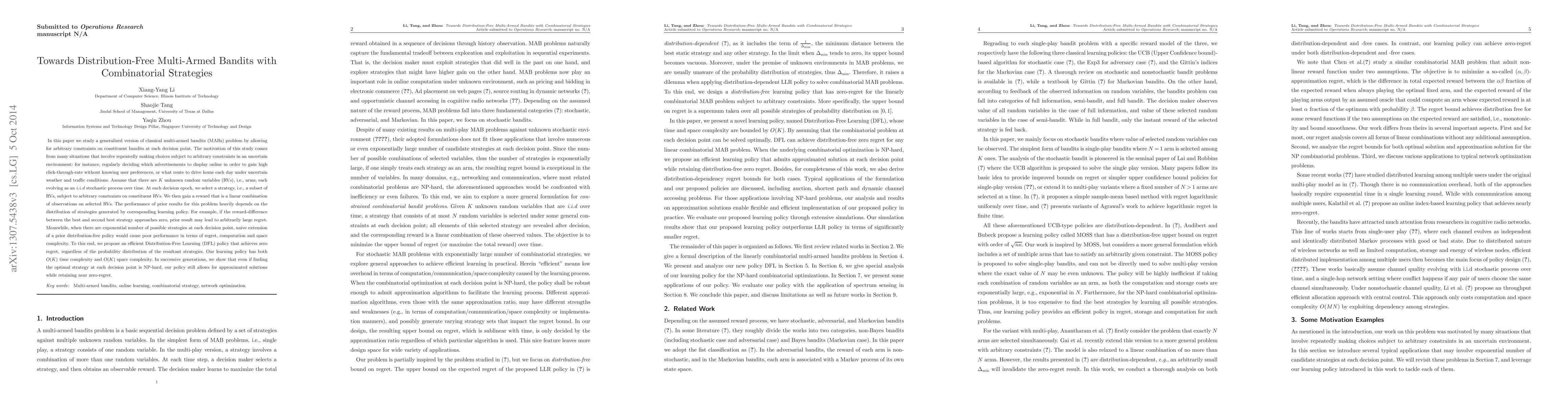 In this paper we study a generalized version of classical multi-armed bandits (MABs) problem by allowing for arbitrary constraints on constituent bandits at each decision point. The motivation of this study comes from many situations that involve repeatedly making choices subject to arbitrary constraints in an uncertain environment: for instance, regularly deciding which advertisements to display online in order to gain high click-through-rate without knowing user preferences, or what route to drive home each day under uncertain weather and traffic conditions. Assume that there are $K$ unknown random variables (RVs), i.e., arms, each evolving as an \emph{i.i.d} stochastic process over time. At each decision epoch, we select a strategy, i.e., a subset of RVs, subject to arbitrary constraints on constituent RVs. We then gain a reward that is a linear combination of observations on selected RVs. The performance of prior results for this problem heavily depends on the distribution of strategies generated by corresponding learning policy. For example, if the reward-difference between the best and second best strategy approaches zero, prior result may lead to arbitrarily large regret. Meanwhile, when there are exponential number of possible strategies at each decision point, naive extension of a prior distribution-free policy would cause poor performance in terms of regret, computation and space complexity. To this end, we propose an efficient Distribution-Free Learning (DFL) policy that achieves zero regret, regardless of the probability distribution of the resultant strategies. Our learning policy has both $O(K)$ time complexity and $O(K)$ space complexity. In successive generations, we show that even if finding the optimal strategy at each decision point is NP-hard, our policy still allows for approximated solutions while retaining near zero-regret.