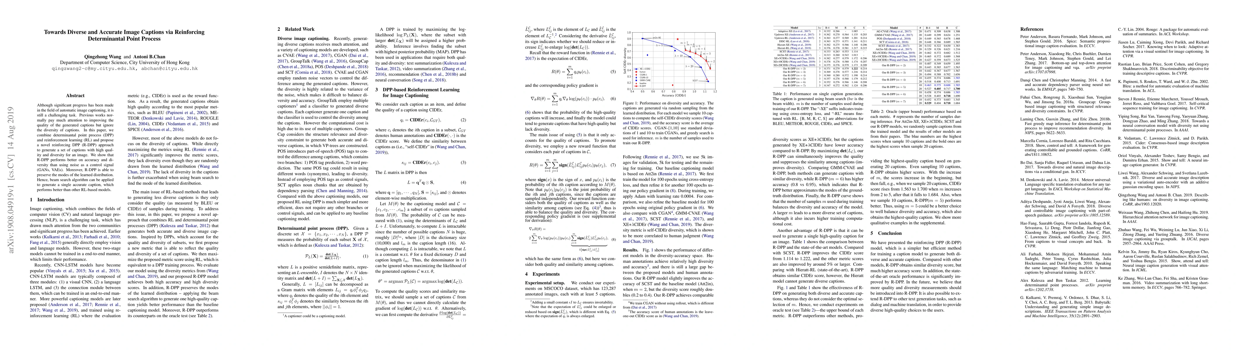 A new approach called R-DPP improves image captioning accuracy and diversity by combining determinantal point process and reinforcement learning, outperforming traditional methods like GANs and VAEs.
