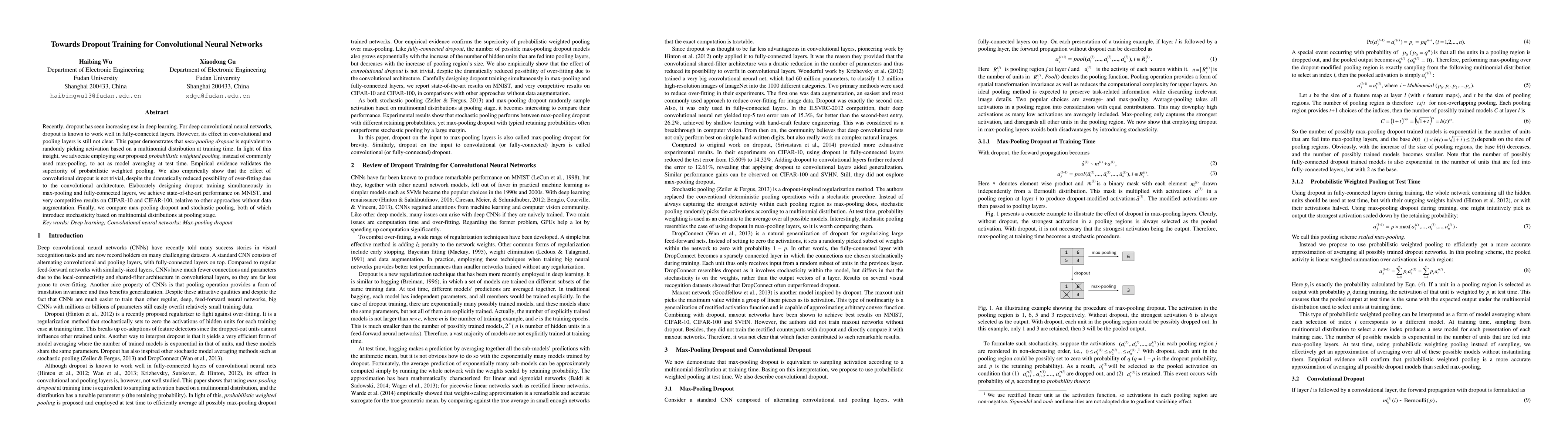 This paper explores the application of dropout in convolutional neural networks, demonstrating that dropout in max-pooling layers can be seen as a multinomial distribution-based selection of activations. It proposes probabilistic weighted pooling over max-pooling for better model averaging at test time, achieving state-of-the-art performance on MNIST and competitive results on CIFAR datasets.