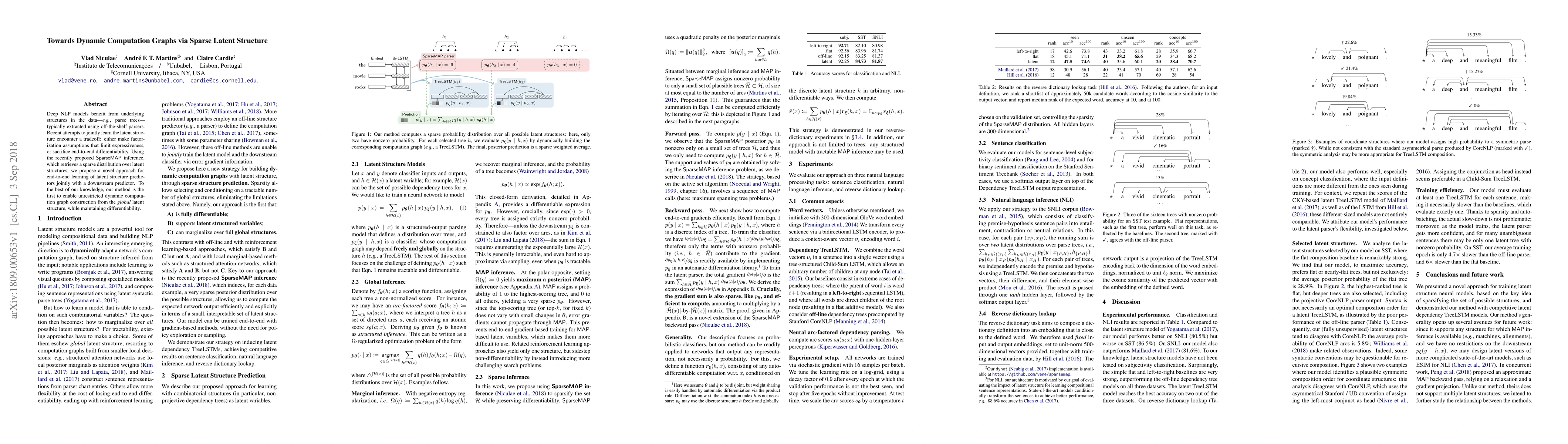 Deep NLP models benefit from underlying structures in the data---e.g., parse trees---typically extracted using off-the-shelf parsers. Recent attempts to jointly learn the latent structure encounter a tradeoff: either make factorization assumptions that limit expressiveness, or sacrifice end-to-end differentiability. Using the recently proposed SparseMAP inference, which retrieves a sparse distribution over latent structures, we propose a novel approach for end-to-end learning of latent structure predictors jointly with a downstream predictor. To the best of our knowledge, our method is the first to enable unrestricted dynamic computation graph construction from the global latent structure, while maintaining differentiability.