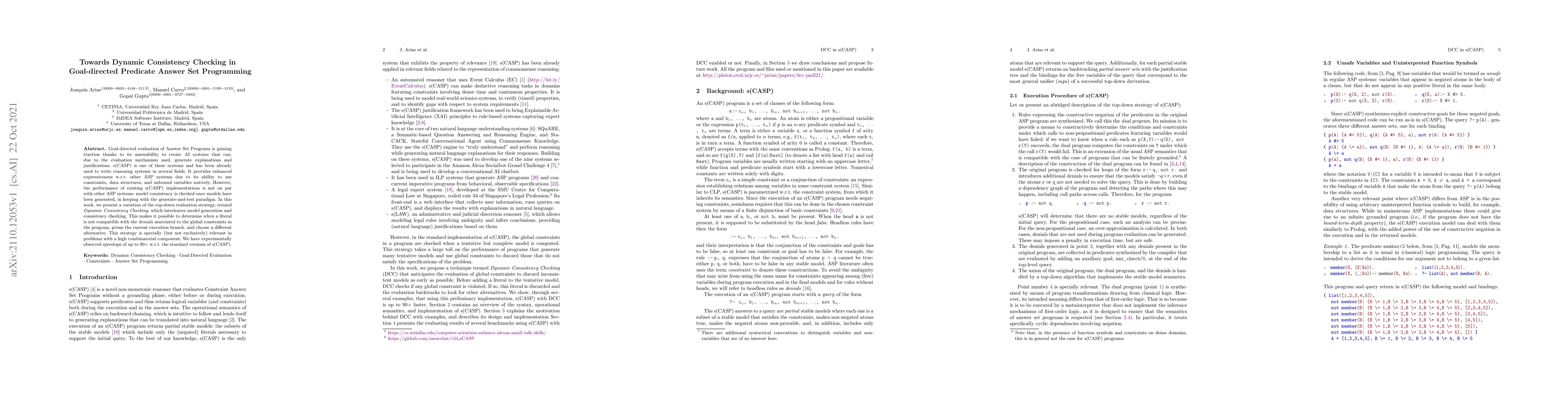 Goal-directed evaluation of Answer Set Programs is gaining traction thanks to its amenability to create AI systems that can, due to the evaluation mechanism used, generate explanations and justifications. s(CASP) is one of these systems and has been already used to write reasoning systems in several fields. It provides enhanced expressiveness w.r.t. other ASP systems due to its ability to use constraints, data structures, and unbound variables natively. However, the performance of existing s(CASP) implementations is not on par with other ASP systems: model consistency is checked once models have been generated, in keeping with the generate-and-test paradigm. In this work, we present a variation of the top-down evaluation strategy, termed Dynamic Consistency Checking, which interleaves model generation and consistency checking. This makes it possible to determine when a literal is not compatible with the denials associated to the global constraints in the program, prune the current execution branch, and choose a different alternative. This strategy is specially (but not exclusively) relevant in problems with a high combinatorial component. We have experimentally observed speedups of up to 90x w.r.t. the standard versions of s(CASP).
