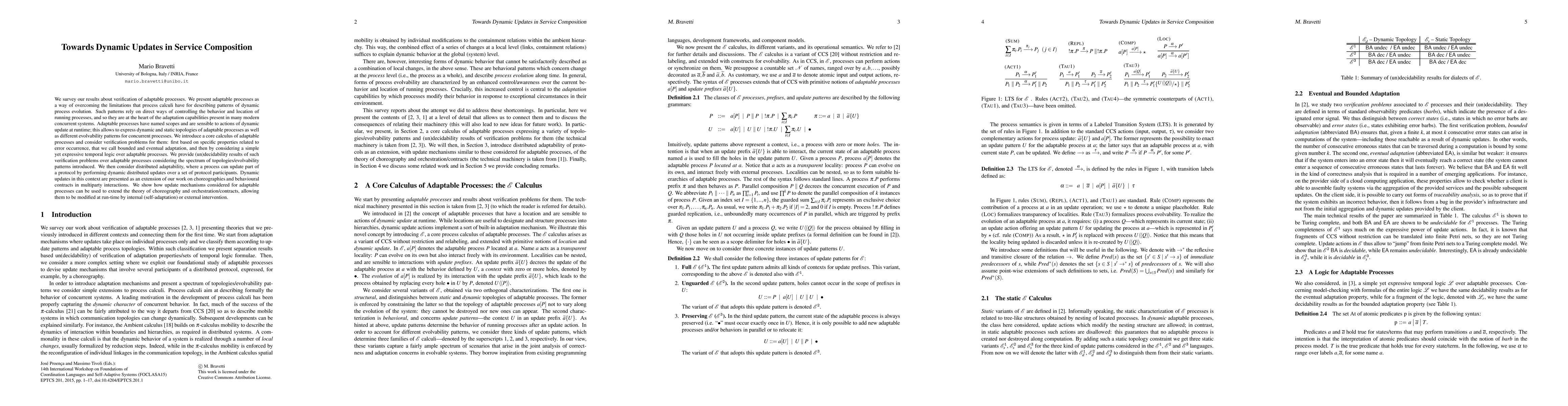 We survey our results about verification of adaptable processes. We present adaptable processes as a way of overcoming the limitations that process calculi have for describing patterns of dynamic process evolution. Such patterns rely on direct ways of controlling the behavior and location of running processes, and so they are at the heart of the adaptation capabilities present in many modern concurrent systems. Adaptable processes have named scopes and are sensible to actions of dynamic update at runtime; this allows to express dynamic and static topologies of adaptable processes as well as different evolvability patterns for concurrent processes. We introduce a core calculus of adaptable processes and consider verification problems for them: first based on specific properties related to error occurrence, that we call bounded and eventual adaptation, and then by considering a simple yet expressive temporal logic over adaptable processes. We provide (un)decidability results of such verification problems over adaptable processes considering the spectrum of topologies/evolvability patterns introduced. We then consider distributed adaptability, where a process can update part of a protocol by performing dynamic distributed updates over a set of protocol participants. Dynamic updates in this context are presented as an extension of our work on choreographies and behavioural contracts in multiparty interactions. We show how update mechanisms considered for adaptable processes can be used to extend the theory of choreography and orchestration/contracts, allowing them to be modified at run-time by internal (self-adaptation) or external intervention.