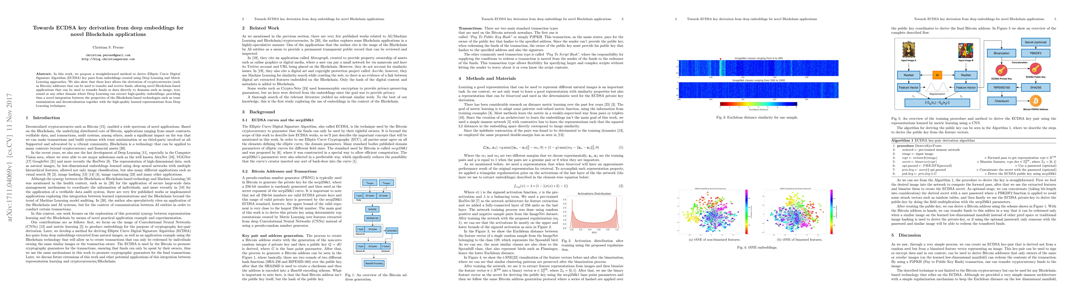 In this work, we propose a straightforward method to derive Elliptic Curve Digital Signature Algorithm (ECDSA) key pairs from embeddings created using Deep Learning and Metric Learning approaches. We also show that these keys allows the derivation of cryptocurrencies (such as Bitcoin) addresses that can be used to transfer and receive funds, allowing novel Blockchain-based applications that can be used to transfer funds or data directly to domains such as image, text, sound or any other domain where Deep Learning can extract high-quality embeddings; providing thus a novel integration between the properties of the Blockchain-based technologies such as trust minimization and decentralization together with the high-quality learned representations from Deep Learning techniques.