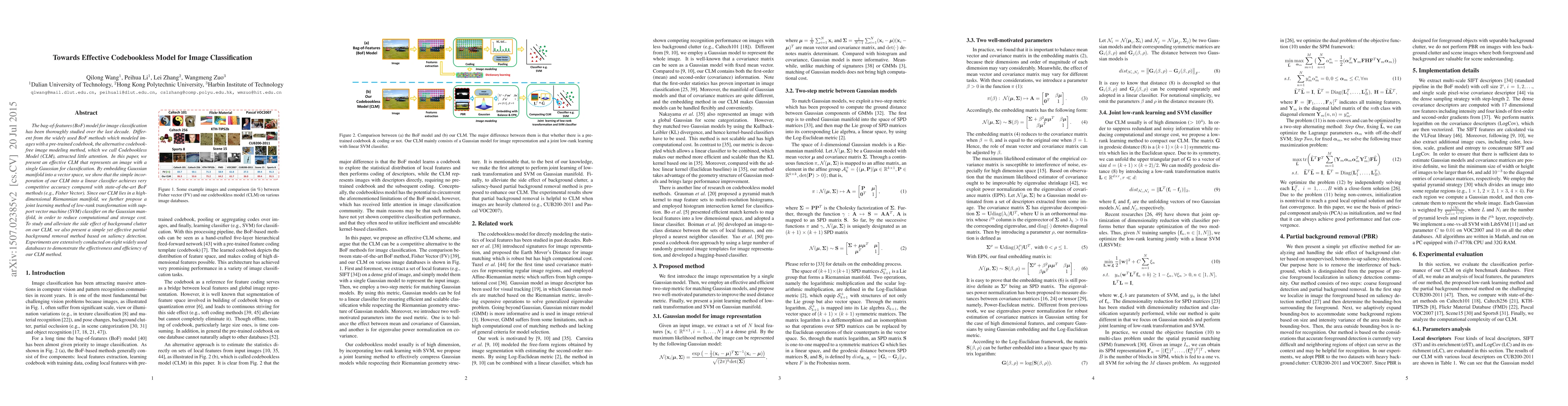 The bag-of-features (BoF) model for image classification has been thoroughly studied over the last decade. Different from the widely used BoF methods which modeled images with a pre-trained codebook, the alternative codebook free image modeling method, which we call Codebookless Model (CLM), attracted little attention. In this paper, we present an effective CLM that represents an image with a single Gaussian for classification. By embedding Gaussian manifold into a vector space, we show that the simple incorporation of our CLM into a linear classifier achieves very competitive accuracy compared with state-of-the-art BoF methods (e.g., Fisher Vector). Since our CLM lies in a high dimensional Riemannian manifold, we further propose a joint learning method of low-rank transformation with support vector machine (SVM) classifier on the Gaussian manifold, in order to reduce computational and storage cost. To study and alleviate the side effect of background clutter on our CLM, we also present a simple yet effective partial background removal method based on saliency detection. Experiments are extensively conducted on eight widely used databases to demonstrate the effectiveness and efficiency of our CLM method.