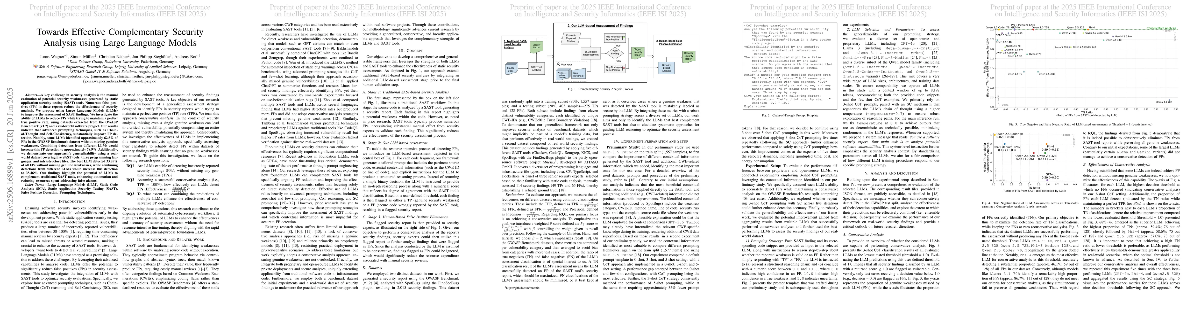 A key challenge in security analysis is the manual evaluation of potential security weaknesses generated by static application security testing (SAST) tools. Numerous false positives (FPs) in these reports reduce the effectiveness of security analysis. We propose using Large Language Models (LLMs) to improve the assessment of SAST findings. We investigate the ability of LLMs to reduce FPs while trying to maintain a perfect true positive rate, using datasets extracted from the OWASP Benchmark (v1.2) and a real-world software project. Our results indicate that advanced prompting techniques, such as Chain-of-Thought and Self-Consistency, substantially improve FP detection. Notably, some LLMs identified approximately 62.5% of FPs in the OWASP Benchmark dataset without missing genuine weaknesses. Combining detections from different LLMs would increase this FP detection to approximately 78.9%. Additionally, we demonstrate our approach's generalizability using a real-world dataset covering five SAST tools, three programming languages, and infrastructure files. The best LLM detected 33.85% of all FPs without missing genuine weaknesses, while combining detections from different LLMs would increase this detection to 38.46%. Our findings highlight the potential of LLMs to complement traditional SAST tools, enhancing automation and reducing resources spent addressing false alarms.