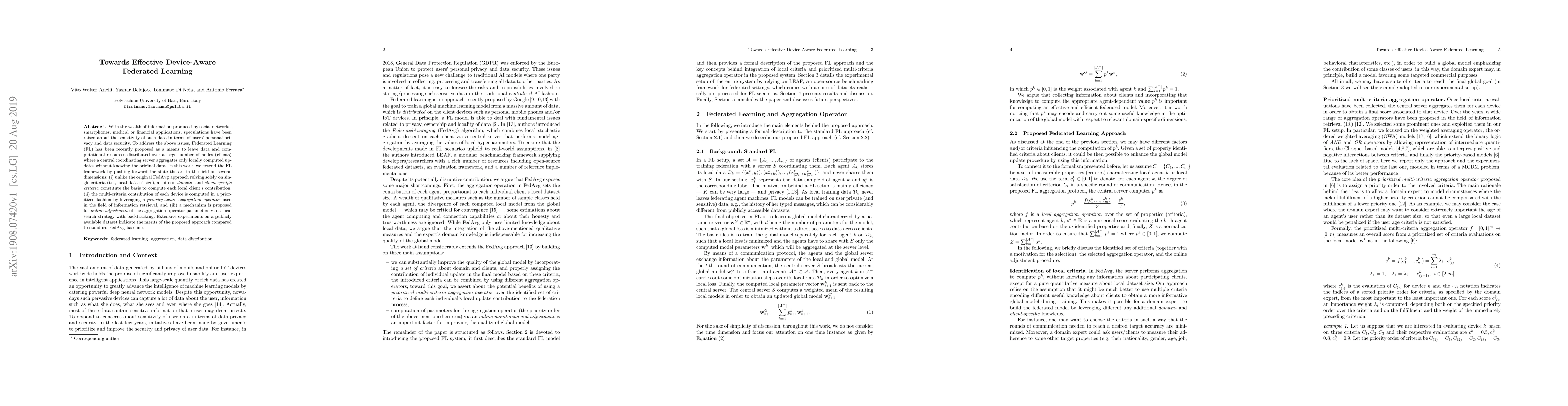 With the wealth of information produced by social networks, smartphones, medical or financial applications, speculations have been raised about the sensitivity of such data in terms of users' personal privacy and data security. To address the above issues, Federated Learning (FL) has been recently proposed as a means to leave data and computational resources distributed over a large number of nodes (clients) where a central coordinating server aggregates only locally computed updates without knowing the original data. In this work, we extend the FL framework by pushing forward the state the art in the field on several dimensions: (i) unlike the original FedAvg approach relying solely on single criteria (i.e., local dataset size), a suite of domain- and client-specific criteria constitute the basis to compute each local client's contribution, (ii) the multi-criteria contribution of each device is computed in a prioritized fashion by leveraging a priority-aware aggregation operator used in the field of information retrieval, and (iii) a mechanism is proposed for online-adjustment of the aggregation operator parameters via a local search strategy with backtracking. Extensive experiments on a publicly available dataset indicate the merits of the proposed approach compared to standard FedAvg baseline.