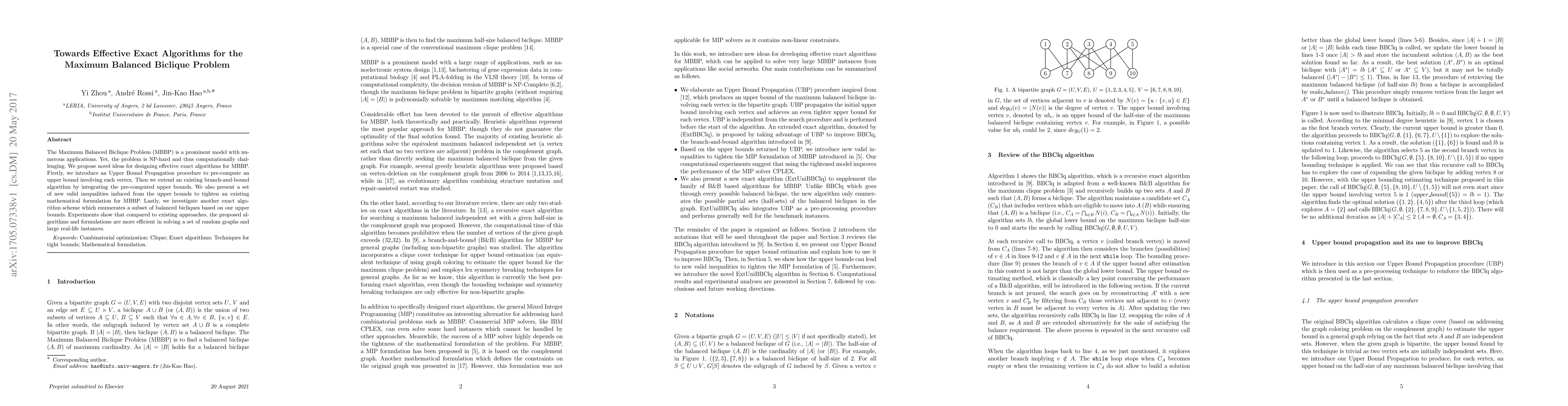This paper introduces novel algorithms for solving the NP-hard Maximum Balanced Biclique Problem (MBBP). It proposes an Upper Bound Propagation procedure and integrates it into a branch-and-bound algorithm, alongside new valid inequalities and a subset enumeration method, demonstrating improved efficiency in experiments.