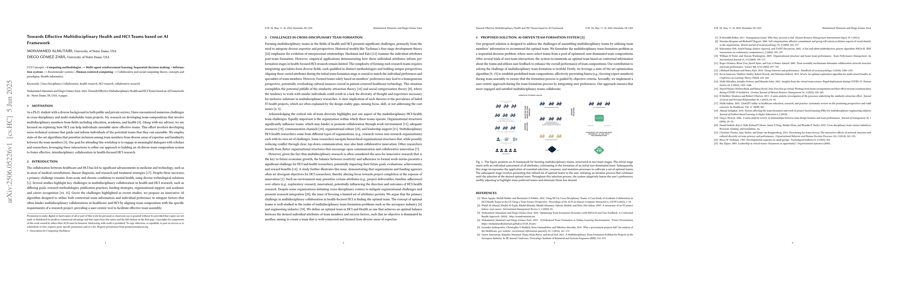 As a Ph.D. student with a diverse background in both public and private sectors, I have encountered numerous challenges in cross-disciplinary and multi-stakeholder team projects. My research on developing team compositions that involve multidisciplinary members from fields including education, academia, and health. Along with my advisor, we are focused on exploring how HCI can help individuals assemble more effective teams. This effort involves developing socio-technical systems that guide and inform individuals of the potential teams that they can assemble. We employ state-of-the-art algorithms that prioritize inclusion among team members from diverse areas of expertise and familiarity between the team members. Our goal for attending this workshop is to engage in meaningful dialogues with scholars and researchers, leveraging these interactions to refine our approach to building an AI-driven team composition system to foster effective, interdisciplinary collaboration in health-focused HCI research.