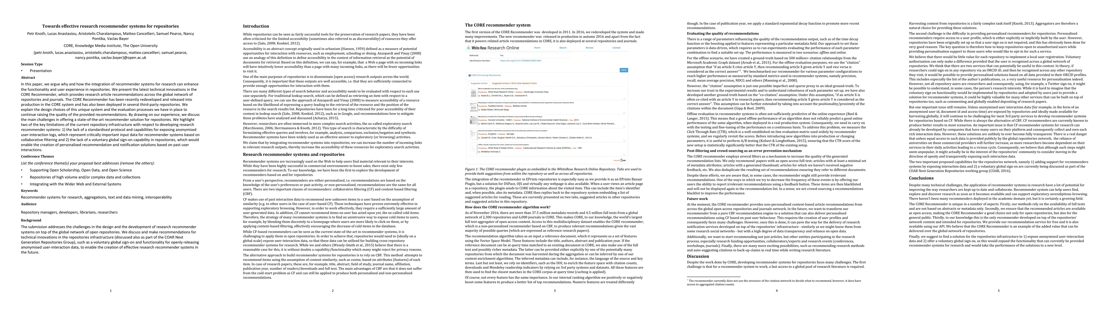This paper explores the integration of recommender systems in research repositories to enhance functionality and user experience, presenting the CORE Recommender's technical innovations and deployment. It discusses challenges such as the lack of standardised user-interaction logs and global sign-on capabilities for personalised recommendations.