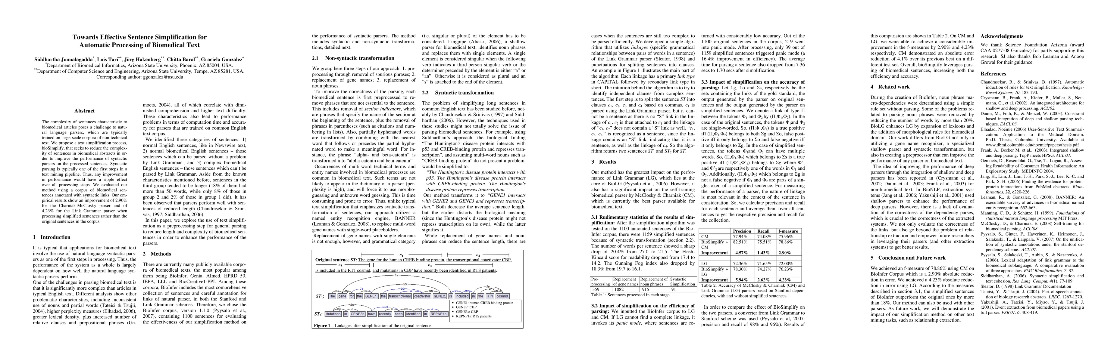 This paper proposes bioSimplify, a method to simplify complex sentences in biomedical texts to enhance syntactic parsing performance. Empirical results indicate a 2.90% and 4.23% improvement for Charniak-McClosky and Link Grammar parsers respectively when parsing simplified sentences.