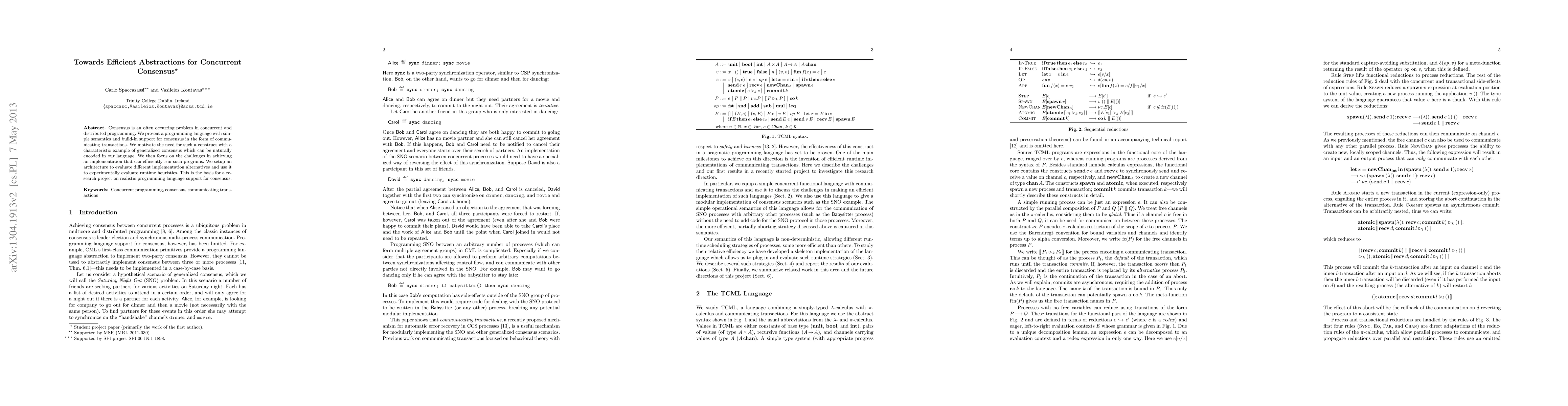 Consensus is an often occurring problem in concurrent and distributed programming. We present a programming language with simple semantics and build-in support for consensus in the form of communicating transactions. We motivate the need for such a construct with a characteristic example of generalized consensus which can be naturally encoded in our language. We then focus on the challenges in achieving an implementation that can efficiently run such programs. We setup an architecture to evaluate different implementation alternatives and use it to experimentally evaluate runtime heuristics. This is the basis for a research project on realistic programming language support for consensus.