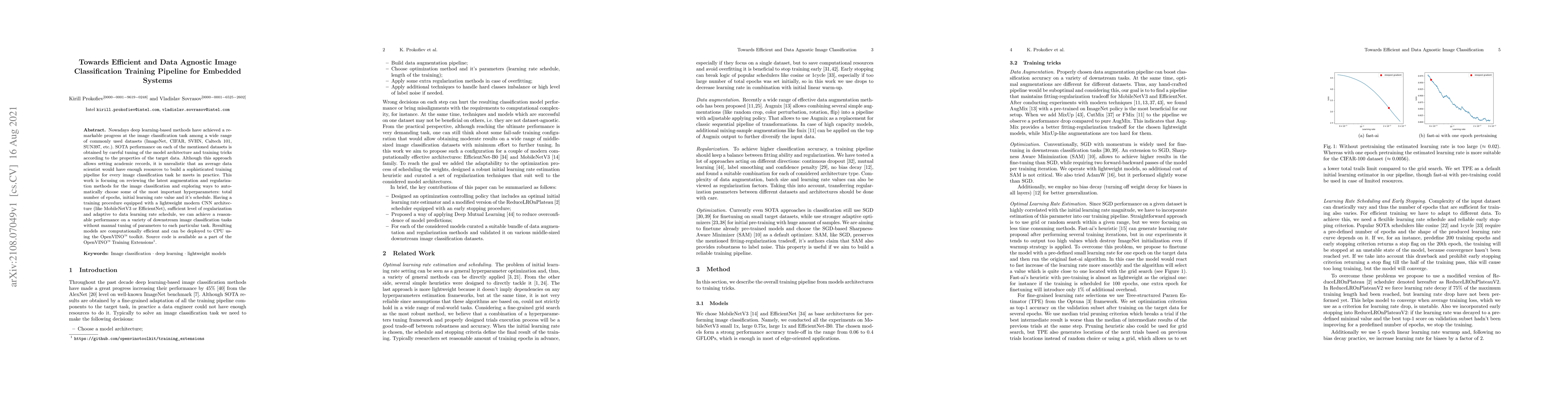 This paper proposes an efficient and data-agnostic image classification training pipeline for embedded systems, utilizing lightweight CNN architectures and adaptive hyperparameters. It aims to achieve reasonable performance across various datasets without extensive manual tuning, leveraging modern augmentation and regularization techniques.