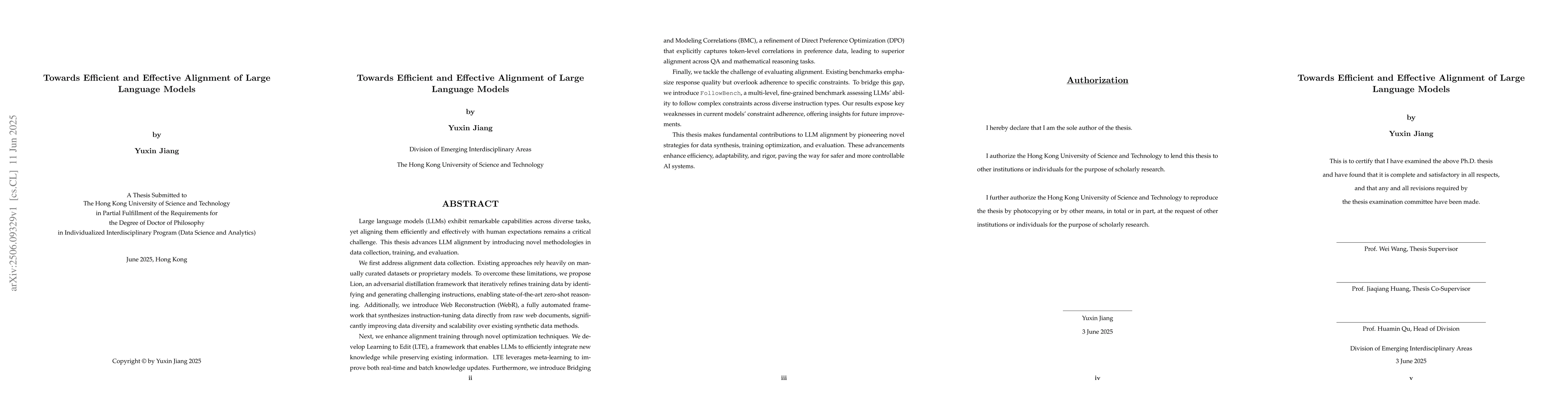 Large language models (LLMs) exhibit remarkable capabilities across diverse tasks, yet aligning them efficiently and effectively with human expectations remains a critical challenge. This thesis advances LLM alignment by introducing novel methodologies in data collection, training, and evaluation. We first address alignment data collection. Existing approaches rely heavily on manually curated datasets or proprietary models. To overcome these limitations, we propose Lion, an adversarial distillation framework that iteratively refines training data by identifying and generating challenging instructions, enabling state-of-the-art zero-shot reasoning. Additionally, we introduce Web Reconstruction (WebR), a fully automated framework that synthesizes instruction-tuning data directly from raw web documents, significantly improving data diversity and scalability over existing synthetic data methods. Next, we enhance alignment training through novel optimization techniques. We develop Learning to Edit (LTE), a framework that enables LLMs to efficiently integrate new knowledge while preserving existing information. LTE leverages meta-learning to improve both real-time and batch knowledge updates. Furthermore, we introduce Bridging and Modeling Correlations (BMC), a refinement of Direct Preference Optimization (DPO) that explicitly captures token-level correlations in preference data, leading to superior alignment across QA and mathematical reasoning tasks. Finally, we tackle the challenge of evaluating alignment. Existing benchmarks emphasize response quality but overlook adherence to specific constraints. To bridge this gap, we introduce FollowBench, a multi-level, fine-grained benchmark assessing LLMs' ability to follow complex constraints across diverse instruction types. Our results expose key weaknesses in current models' constraint adherence, offering insights for future improvements.