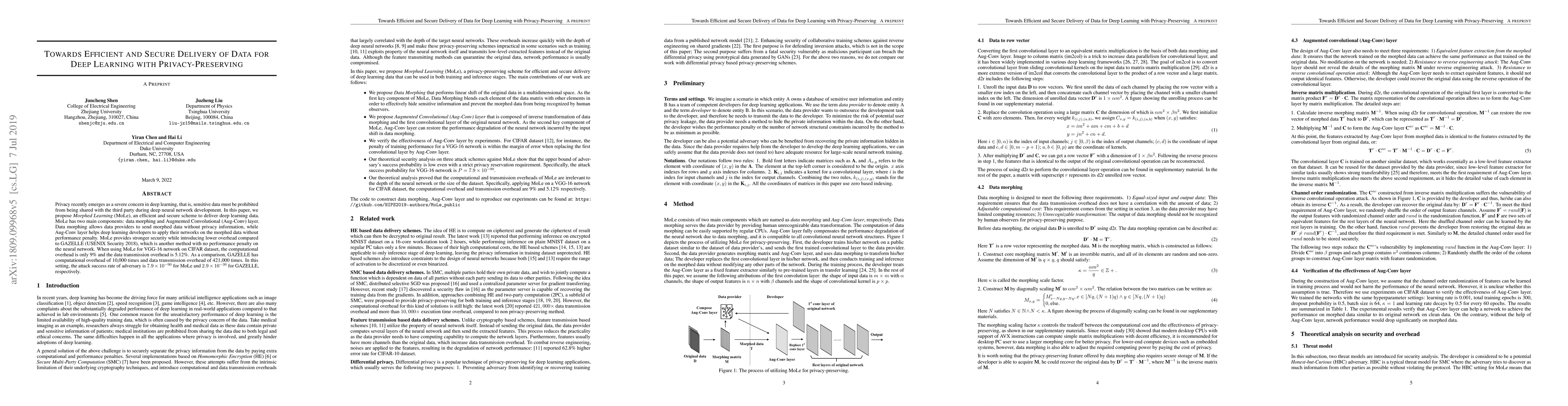 Privacy recently emerges as a severe concern in deep learning, that is, sensitive data must be prohibited from being shared with the third party during deep neural network development. In this paper, we propose Morphed Learning (MoLe), an efficient and secure scheme to deliver deep learning data. MoLe has two main components: data morphing and Augmented Convolutional (Aug-Conv) layer. Data morphing allows data providers to send morphed data without privacy information, while Aug-Conv layer helps deep learning developers to apply their networks on the morphed data without performance penalty. MoLe provides stronger security while introducing lower overhead compared to GAZELLE (USENIX Security 2018), which is another method with no performance penalty on the neural network. When using MoLe for VGG-16 network on CIFAR dataset, the computational overhead is only 9% and the data transmission overhead is 5.12%. As a comparison, GAZELLE has computational overhead of 10,000 times and data transmission overhead of 421,000 times. In this setting, the attack success rate of adversary is 7.9 x 10^{-90} for MoLe and 2.9 x 10^{-30} for GAZELLE, respectively.