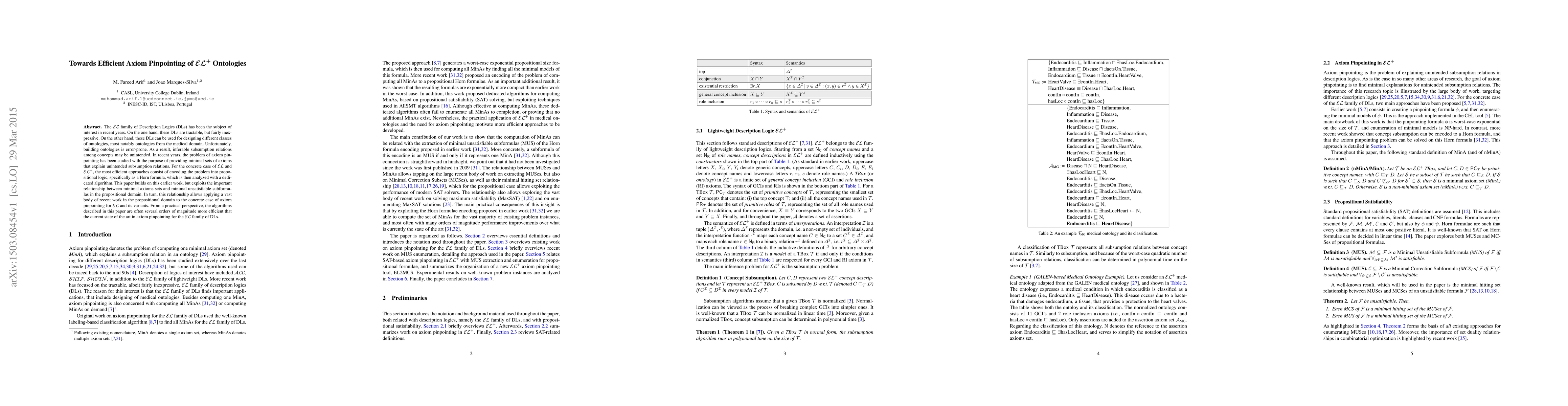 The EL family of Description Logics (DLs) has been the subject of interest in recent years. On the one hand, these DLs are tractable, but fairly inexpressive. On the other hand, these DLs can be used for designing different classes of ontologies, most notably ontologies from the medical domain. Unfortunately, building ontologies is error-prone. As a result, inferable subsumption relations among concepts may be unintended. In recent years, the problem of axiom pinpointing has been studied with the purpose of providing minimal sets of axioms that explain unintended subsumption relations. For the concrete case of EL and EL+, the most efficient approaches consist of encoding the problem into propositional logic, specifically as a Horn formula, which is then analyzed with a dedicated algorithm. This paper builds on this earlier work, but exploits the important relationship between minimal axioms sets and minimal unsatisfiable subformulas in the propositional domain. In turn, this relationship allows applying a vast body of recent work in the propositional domain to the concrete case of axiom pinpointing for EL and its variants. From a practical perspective, the algorithms described in this paper are often several orders of magnitude more efficient that the current state of the art in axiom pinpointing for the EL family of DLs.