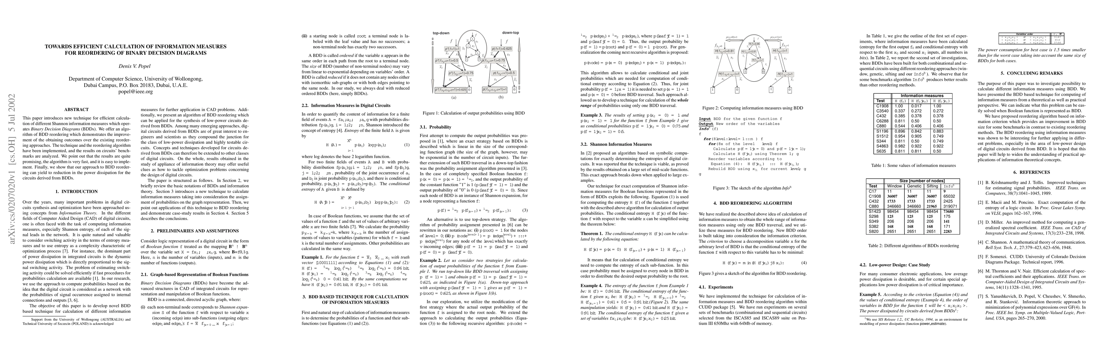 This paper introduces new technique for efficient calculation of different Shannon information measures which operates Binary Decision Diagrams (BDDs). We offer an algorithm of BDD reordering which demonstrates the improvement of the obtaining outcomes over the existing reordering approaches. The technique and the reordering algorithm have been implemented, and the results on circuits' benchmarks are analyzed. We point out that the results are quite promising, the algorithm is very fast, and it is easy to implement. Finally, we show that our approach to BDD reordering can yield to reduction in the power dissipation for the circuits derived from BDDs.