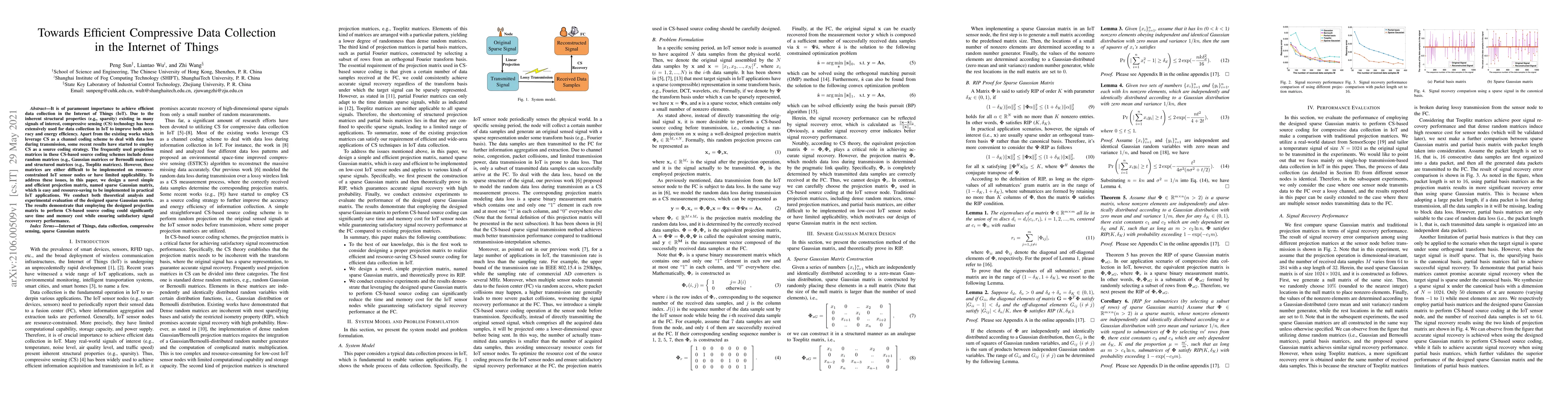 This paper proposes a novel sparse Gaussian matrix for compressive sensing in IoT data collection, aiming to improve efficiency and reduce resource usage. Theoretical and experimental evaluations show that this matrix significantly cuts time and memory costs while maintaining good signal recovery performance.