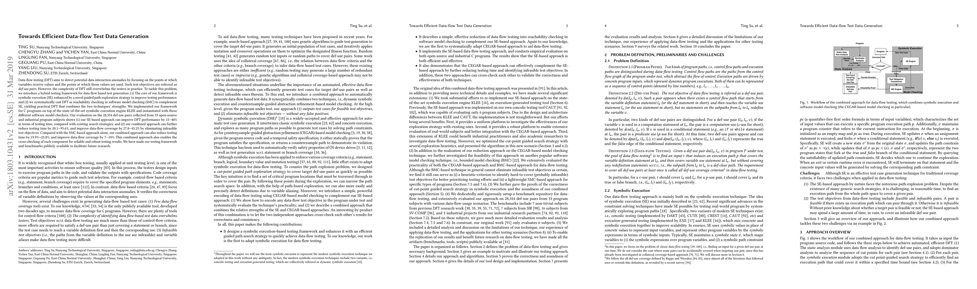 Data-flow testing (DFT) aims to detect potential data interaction anomalies by focusing on the points at which variables receive values and the points at which these values are used. Such test objectives are referred as \emph{def-use pairs}. However, the complexity of DFT still overwhelms the testers in practice. To tackle this problem, we introduce a hybrid testing framework for data-flow based test generation: (1) The core of our framework is symbolic execution (SE), enhanced by a novel guided path exploration strategy to improve testing performance; and (2) we systematically cast DFT as reachability checking in software model checking (SMC) to complement SE, yielding practical DFT that combines the two techniques' strengths. We implemented our framework for C programs on top of the state-of-the-art symbolic execution engine KLEE and instantiated with three different software model checkers. Our evaluation on the 28,354 def-use pairs collected from 33 open-source and industrial program subjects shows (1) our SE-based approach can improve DFT performance by 15$\sim$48% in terms of testing time, compared with existing search strategies; and (2) our combined approach can further reduce testing time by 20.1$\sim$93.6%, and improve data-flow coverage by 27.8$\sim$45.2% by eliminating infeasible test objectives. Compared with the SMC-based approach alone, our combined approach can also reduce testing time by 19.9$\sim$23.8%, and improve data-flow coverage by 7$\sim$10%. This combined approach also enables the cross-checking of each component for reliable and robust testing results. We have made our testing framework and benchmarks publicly available to facilitate future research.