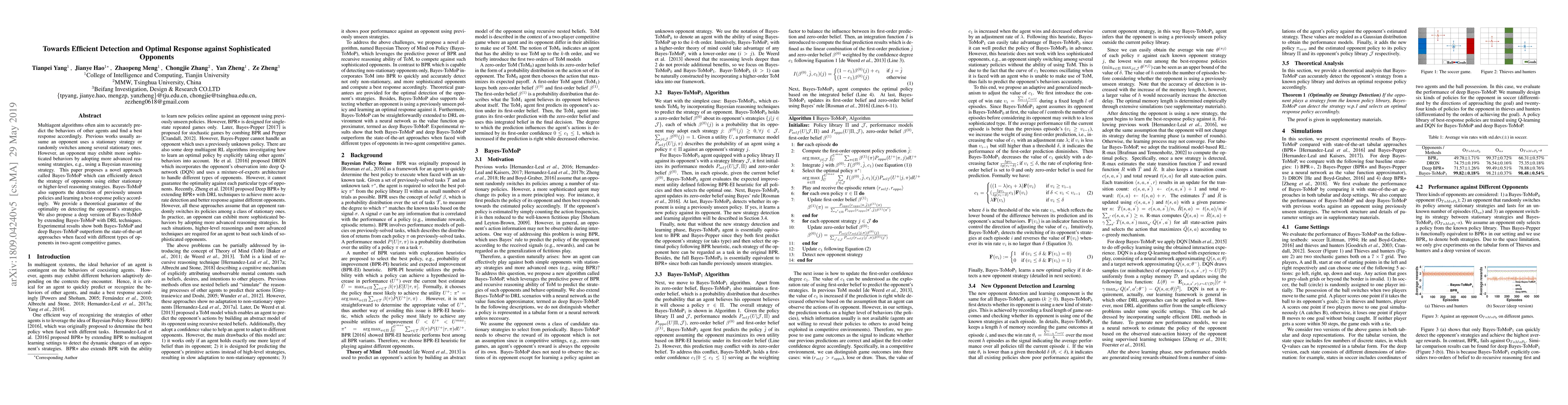 Multiagent algorithms often aim to accurately predict the behaviors of other agents and find a best response accordingly. Previous works usually assume an opponent uses a stationary strategy or randomly switches among several stationary ones. However, an opponent may exhibit more sophisticated behaviors by adopting more advanced reasoning strategies, e.g., using a Bayesian reasoning strategy. This paper proposes a novel approach called Bayes-ToMoP which can efficiently detect the strategy of opponents using either stationary or higher-level reasoning strategies. Bayes-ToMoP also supports the detection of previously unseen policies and learning a best-response policy accordingly. We provide a theoretical guarantee of the optimality on detecting the opponent's strategies. We also propose a deep version of Bayes-ToMoP by extending Bayes-ToMoP with DRL techniques. Experimental results show both Bayes-ToMoP and deep Bayes-ToMoP outperform the state-of-the-art approaches when faced with different types of opponents in two-agent competitive games.