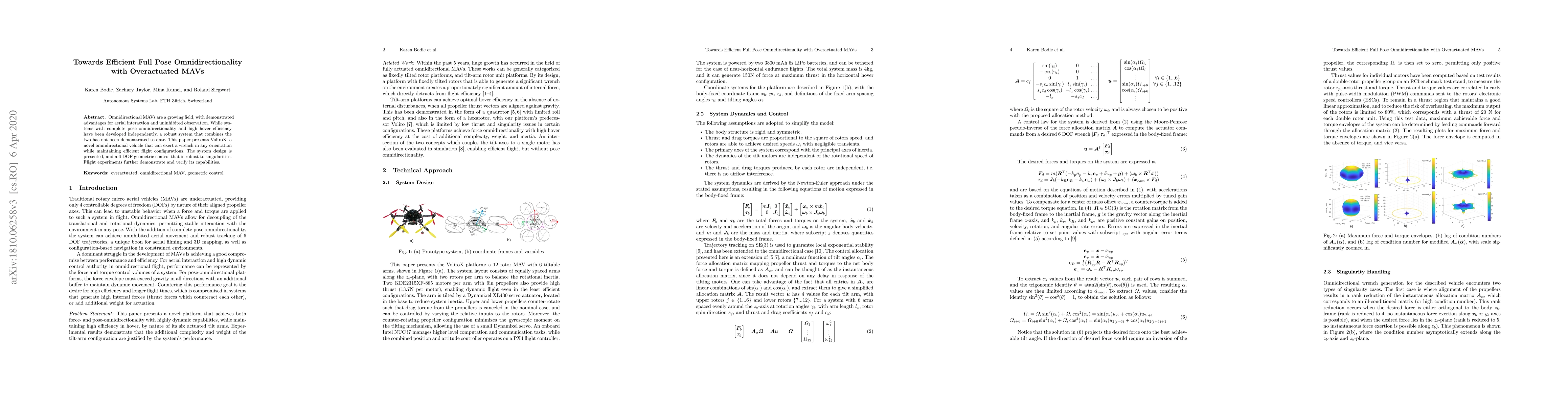 Omnidirectional MAVs are a growing field, with demonstrated advantages for aerial interaction and uninhibited observation. While systems with complete pose omnidirectionality and high hover efficiency have been developed independently, a robust system that combines the two has not been demonstrated to date. This paper presents VoliroX: a novel omnidirectional vehicle that can exert a wrench in any orientation while maintaining efficient flight configurations. The system design is presented, and a 6 DOF geometric control that is robust to singularities. Flight experiments further demonstrate and verify its capabilities.