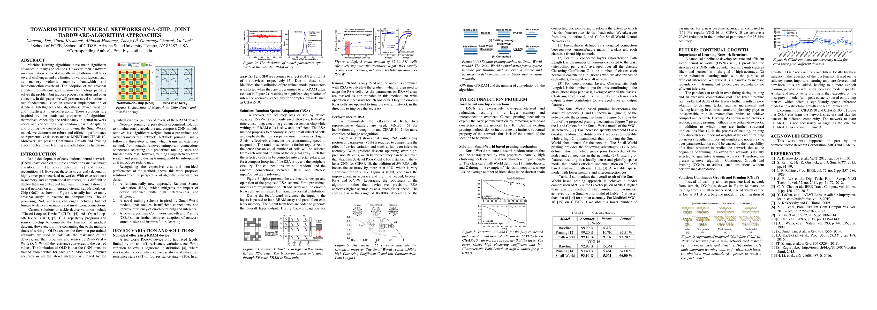 This paper proposes novel solutions to improve neural network performance on-a-chip by reducing device variation and increasing interconnections through Random Sparse Adaptation and pruning, leading to robust and efficient AI algorithm execution.