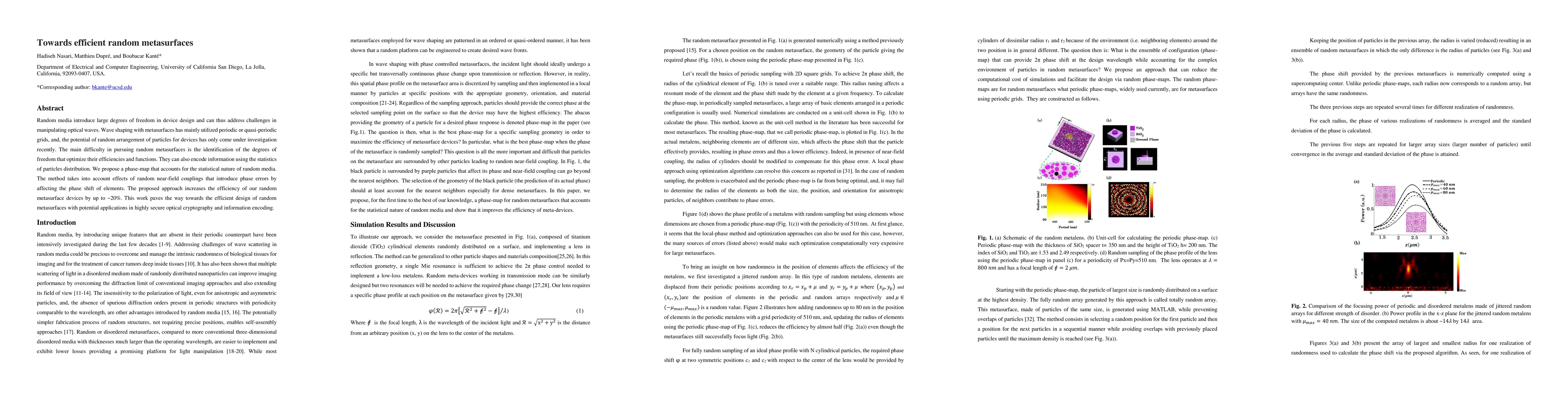 Random media introduce large degrees of freedom in device design and can thus address challenges in manipulating optical waves. Wave shaping with metasurfaces has mainly utilized periodic or quasi-periodic grids, and, the potential of random arrangement of particles for devices has only come under investigation recently. The main difficulty in pursuing random metasurfaces is the identification of the degrees of freedom that optimize their efficiencies and functions. They can also encode information using the statistics of particles distribution. We propose a phase-map that accounts for the statistical nature of random media. The method takes into account effects of random near-field couplings that introduce phase errors by affecting the phase shift of elements. The proposed approach increases the efficiency of our random metasurface devices by up to ~20%. This work paves the way towards the efficient design of random metasurfaces with potential applications in highly secure optical cryptography and information encoding.