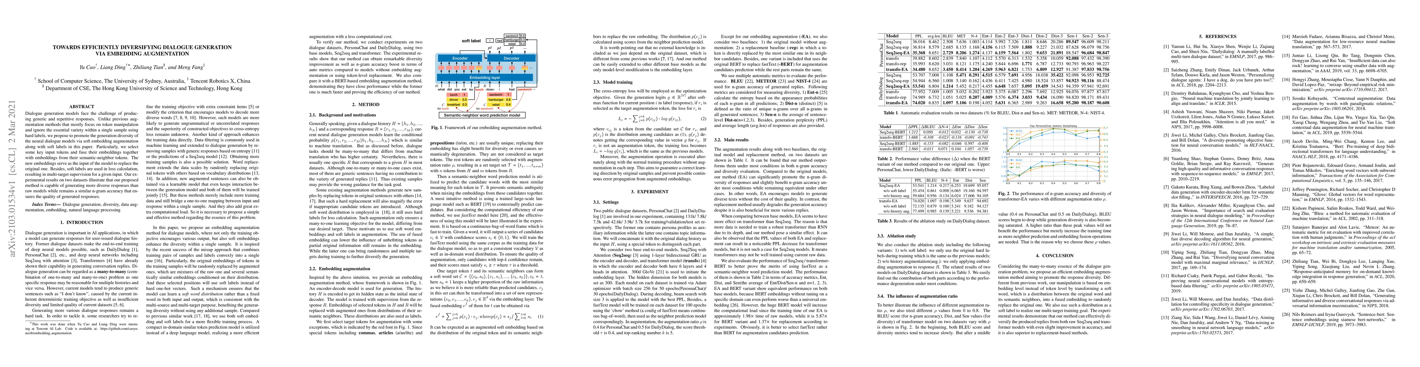 This paper proposes a method to enhance dialogue generation model diversity through soft embedding augmentation and soft labels. By fusing embeddings of key tokens with their semantic neighbors, the model generates more varied responses while maintaining response quality.