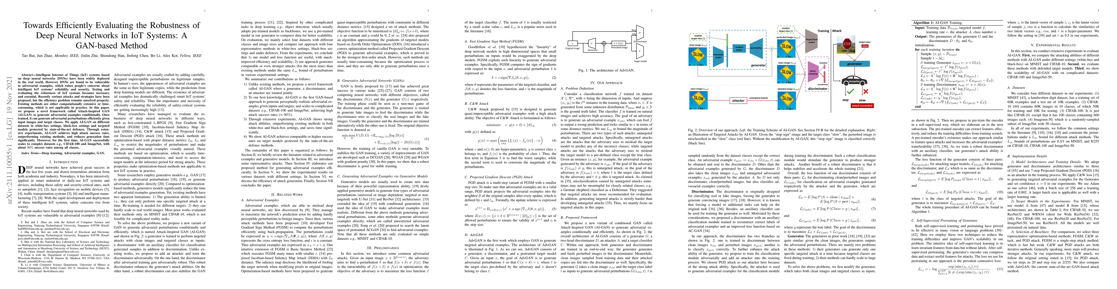 This paper proposes a novel Attack-Inspired GAN (AI-GAN) framework to efficiently generate adversarial examples for evaluating the robustness of deep neural networks in IoT systems. AI-GAN significantly reduces generation time while achieving high attack success rates across various datasets and settings.