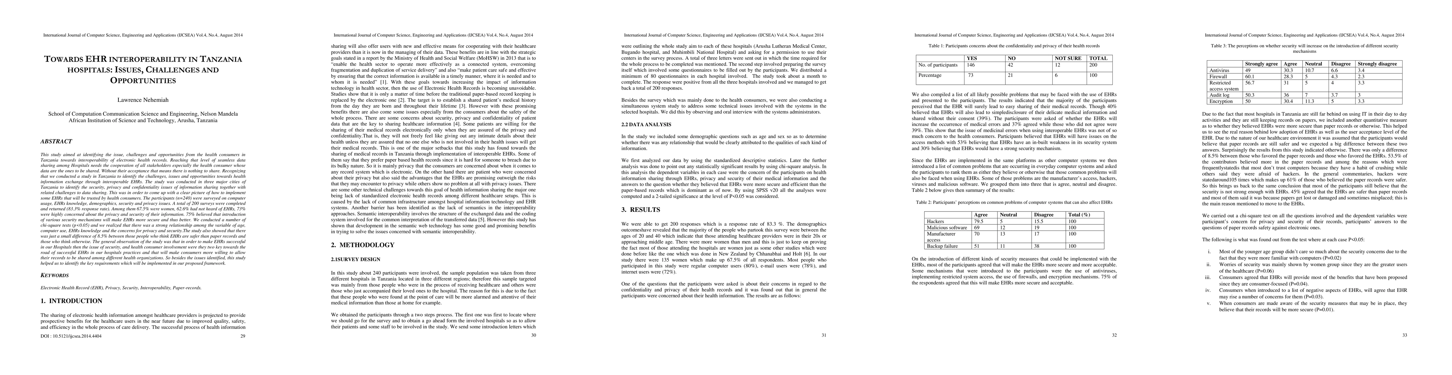 This study surveyed 200 Tanzanian health consumers to identify issues and challenges in electronic health record (EHR) interoperability, finding significant concerns about privacy and security. The study emphasizes that addressing security and involving health consumers are crucial for successful EHR implementation in Tanzanian hospitals.