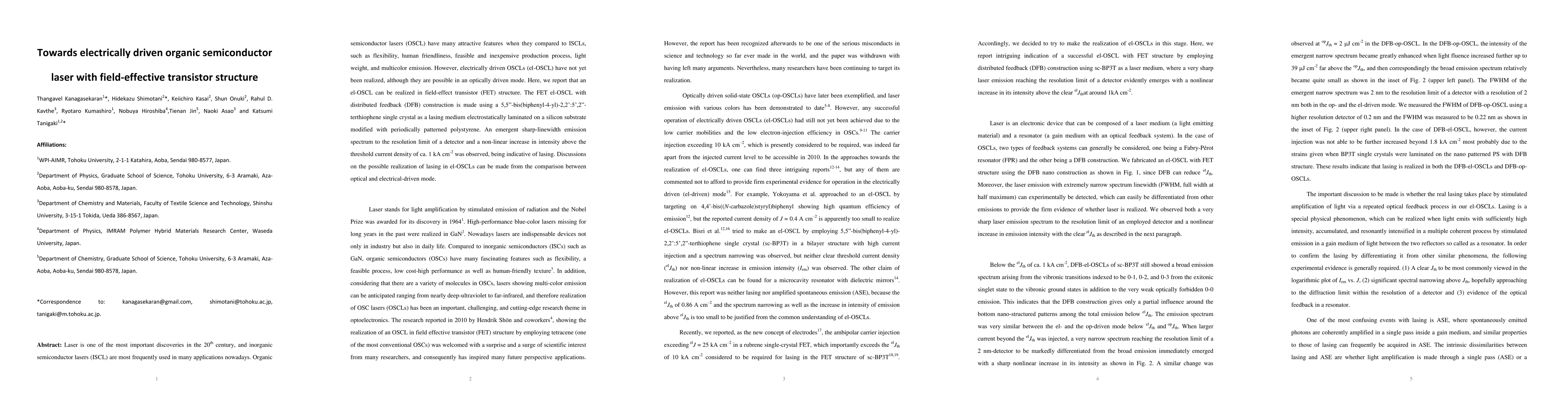 This paper reports the realization of an electrically driven organic semiconductor laser (el-OSCL) using a field-effect transistor structure with a BP3T single crystal as the lasing medium. The study demonstrates sharp-linewidth emission and a non-linear increase in intensity above a threshold current density, indicating the successful operation of the laser.