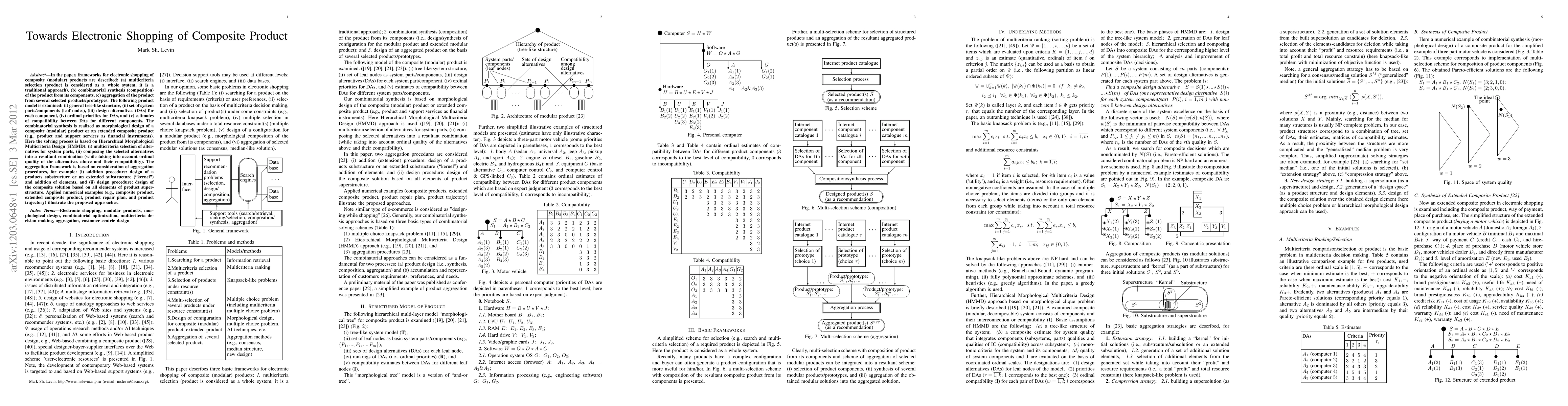 In the paper, frameworks for electronic shopping of composite (modular) products are described: (a) multicriteria selection (product is considered as a whole system, it is a traditional approach), (b) combinatorial synthesis (composition) of the product from its components, (c) aggregation of the product from several selected products/prototypes. The following product model is examined: (i) general tree-like structure, (ii) set of system parts/components (leaf nodes), (iii) design alternatives (DAs) for each component, (iv) ordinal priorities for DAs, and (v) estimates of compatibility between DAs for different components. The combinatorial synthesis is realized as morphological design of a composite (modular) product or an extended composite product (e.g., product and support services as financial instruments). Here the solving process is based on Hierarchical Morphological Multicriteria Design (HMMD): (i) multicriteria selection of alternatives for system parts, (ii) composing the selected alternatives into a resultant combination (while taking into account ordinal quality of the alternatives above and their compatibility). The aggregation framework is based on consideration of aggregation procedures, for example: (i) addition procedure: design of a products substructure or an extended substructure ('kernel') and addition of elements, and (ii) design procedure: design of the composite solution based on all elements of product superstructure. Applied numerical examples (e.g., composite product, extended composite product, product repair plan, and product trajectory) illustrate the proposed approaches.