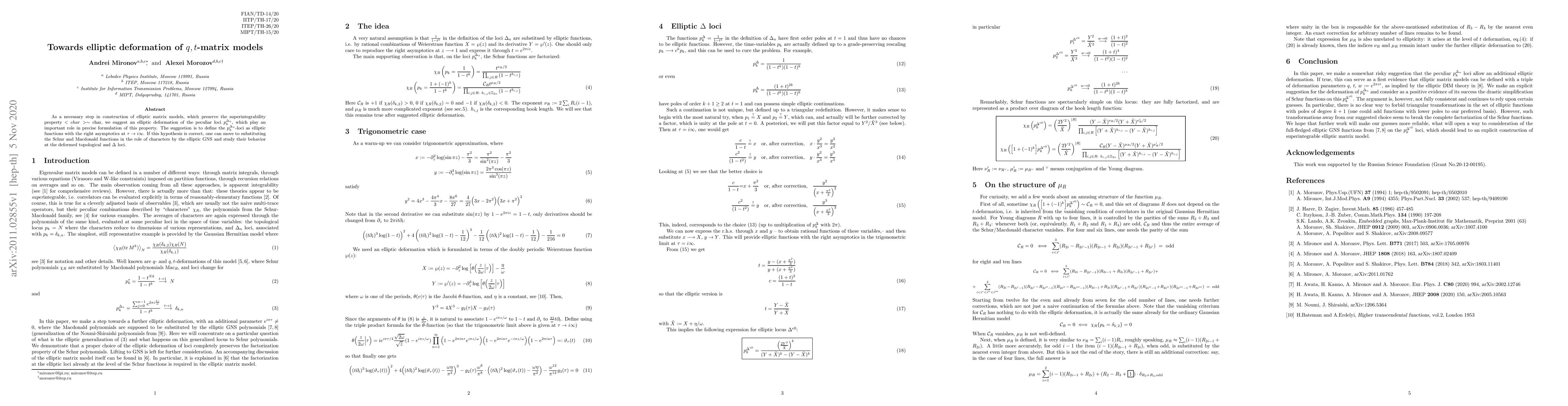 Researchers propose an elliptic deformation of $q,t$-matrix models to preserve superintegrability properties, aiming to substitute Schur and Macdonald functions with elliptic GNS representations.