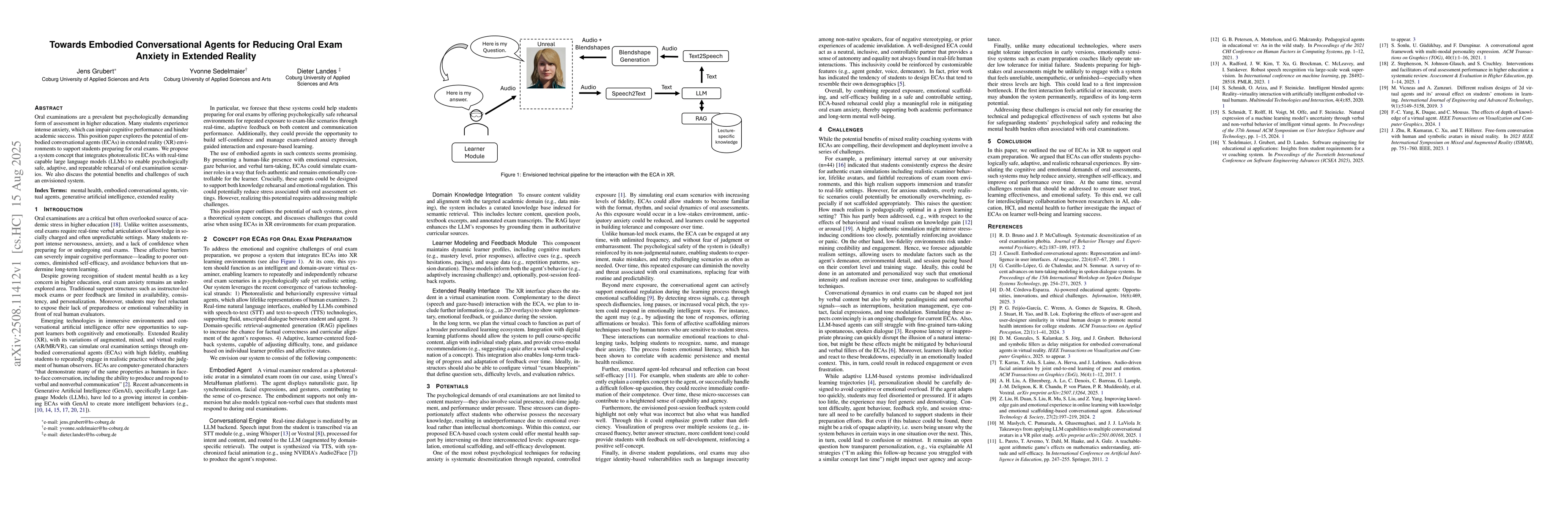 Oral examinations are a prevalent but psychologically demanding form of assessment in higher education. Many students experience intense anxiety, which can impair cognitive performance and hinder academic success. This position paper explores the potential of embodied conversational agents (ECAs) in extended reality (XR) environments to support students preparing for oral exams. We propose a system concept that integrates photorealistic ECAs with real-time capable large language models (LLMs) to enable psychologically safe, adaptive, and repeatable rehearsal of oral examination scenarios. We also discuss the potential benefits and challenges of such an envisioned system.