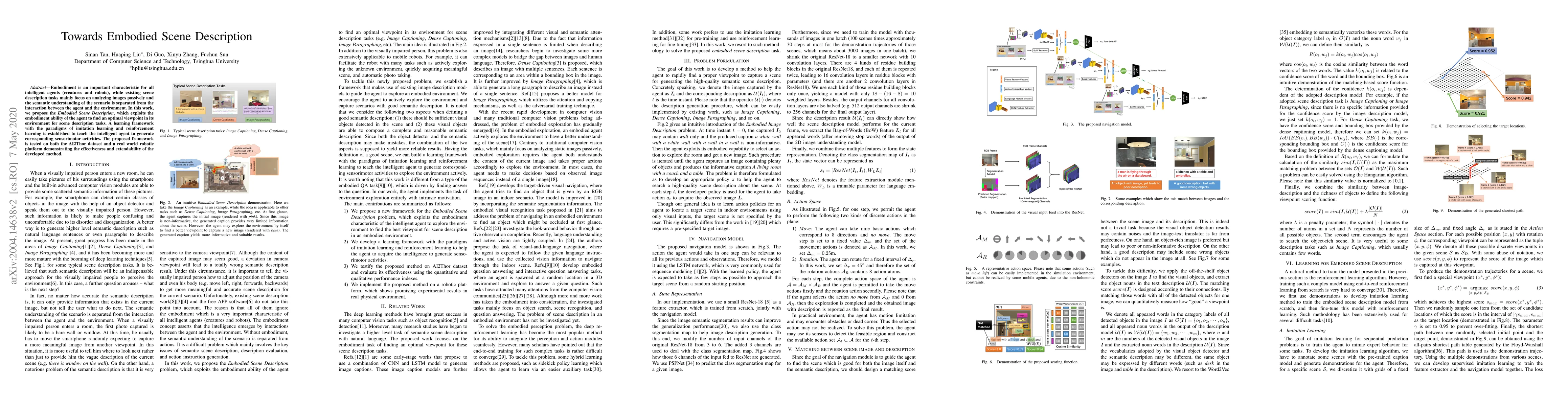 This paper introduces Embodied Scene Description, a method that utilizes an agent's embodiment to locate optimal viewpoints for scene descriptions. The approach combines imitation and reinforcement learning to train agents for sensorimotor activities, proving effective on AI2Thor and real-world robotic platforms.