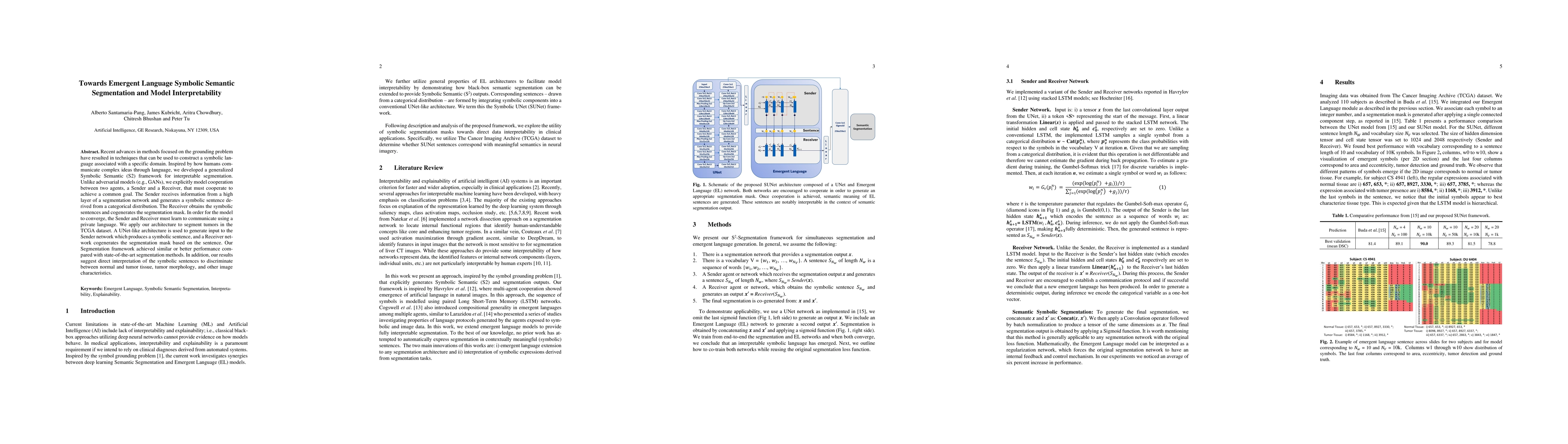 Recent advances in methods focused on the grounding problem have resulted in techniques that can be used to construct a symbolic language associated with a specific domain. Inspired by how humans communicate complex ideas through language, we developed a generalized Symbolic Semantic ($\text{S}^2$) framework for interpretable segmentation. Unlike adversarial models (e.g., GANs), we explicitly model cooperation between two agents, a Sender and a Receiver, that must cooperate to achieve a common goal. The Sender receives information from a high layer of a segmentation network and generates a symbolic sentence derived from a categorical distribution. The Receiver obtains the symbolic sentences and co-generates the segmentation mask. In order for the model to converge, the Sender and Receiver must learn to communicate using a private language. We apply our architecture to segment tumors in the TCGA dataset. A UNet-like architecture is used to generate input to the Sender network which produces a symbolic sentence, and a Receiver network co-generates the segmentation mask based on the sentence. Our Segmentation framework achieved similar or better performance compared with state-of-the-art segmentation methods. In addition, our results suggest direct interpretation of the symbolic sentences to discriminate between normal and tumor tissue, tumor morphology, and other image characteristics.