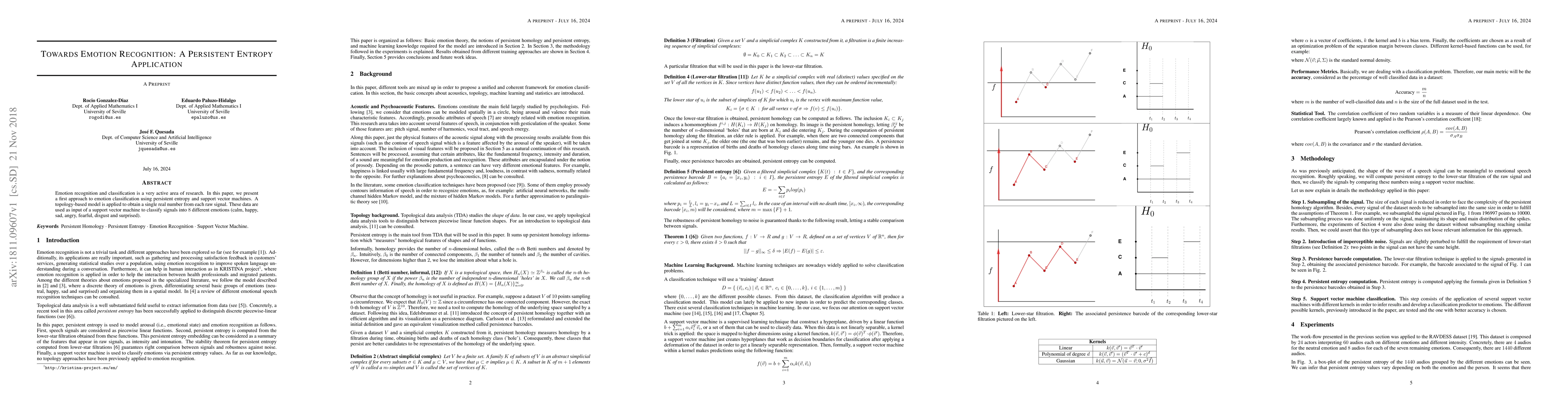 This paper introduces a novel method for emotion classification using persistent entropy and support vector machines, transforming raw signals into a single real number to classify them into eight distinct emotions. The approach employs a topology-based model followed by SVM for accurate emotion recognition.